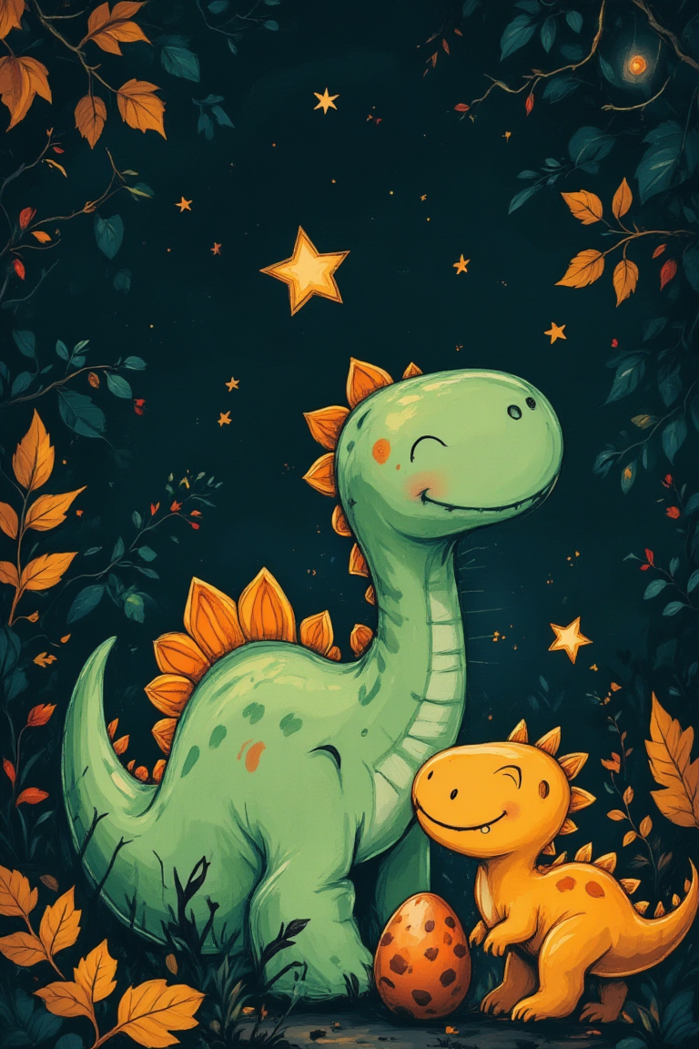 The image is a colorful illustration featuring three cartoon-style dinosaurs set against a dark background. The dinosaurs are depicted with friendly expressions, using shades of green and orange. They have simple designs with rounded features. In the scene: - There is one larger dinosaur in light green with an orange spine. - Two smaller dinosaurs accompany it: one also in light green with similar orange accents on its back, and another in bright orange with brown spots. - An egg matching the color scheme is present near the bottom of the image. - Surrounding them are stylized leaves and stars scattered throughout the background, adding to the whimsical theme. Overall, the design is playful and child-friendly, likely intended for educational or decorative purposes.,aidmafluxpro1.1,Spooky Art Drawing