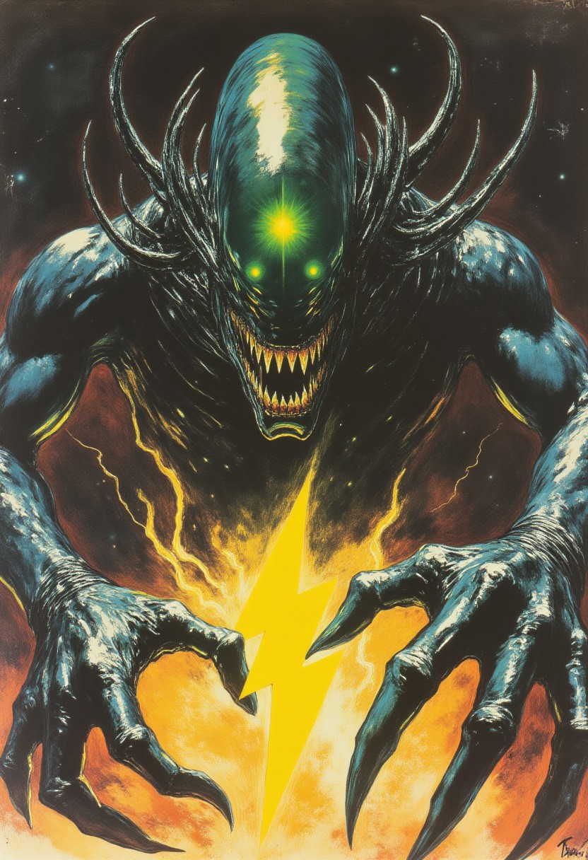80s vintage pulp sci-fi magazine cover of a Xenomorph holding a yellow lightningbolt symbol