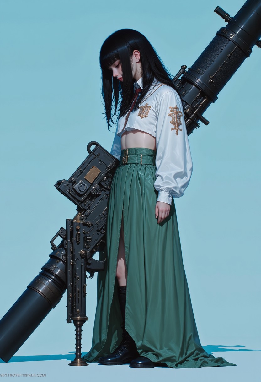 masterpiece, best quality, very aesthetic, absurdres, safe, melancholy, side view, Japanese, school unifrom,standing, realistic vibes, looking down, Japanese, adult,uniform with exposed midriff , assault rifle gun , blue background, fashion phototshoot, pastel, masterpiece, background scene, retro aesthetic, old anime style, 90’s anime style, 4k quality, intricate details, displate artwork , low angle , ground level shot, uniform with only white shirt and green skirt,long socks