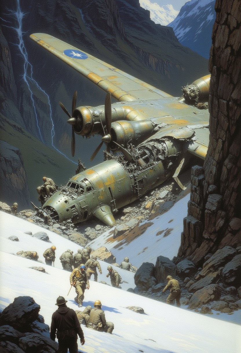 This image is a luminous landscape by Caspar David Friedrich, depicting a Warld War Two (((Boeing B-17 Bomber))) wreckage in the Alps, surrounded by fewer rescuer. The scene should depict the harsh, snowy environment of the Alps mountains. The bomber plane is visibly damaged, mostly in pieces, and its fragments are scattered all over and partially covered in snow. A small group of rescuers is huddled together near the wreckage, dressed in warm clothing to protect against the cold. Some of them are examining the wreck, others are searcing for fragments in the snow. The overall mood is one of desolation and struggle, highlighting the survivors' plight in the remote and unforgiving landscape. The camera angle is slightly tilted downward, emphasizing the woman's determination and the perilous walk. The scene is lit with cool tones, amplifying the icy and treacherous atmosphere. The image exudes a sense of solitude and melancholy, with a hint of mystery and the passage of time. loose brushwork, vibrant color, light and shadow play, captures feeling over form. The colors are dominated by dark tones, silver reflexes, and greens, creating a incumbent yet hauntingly dramatic atmosphere that reflects the danger and desolation of the scene.