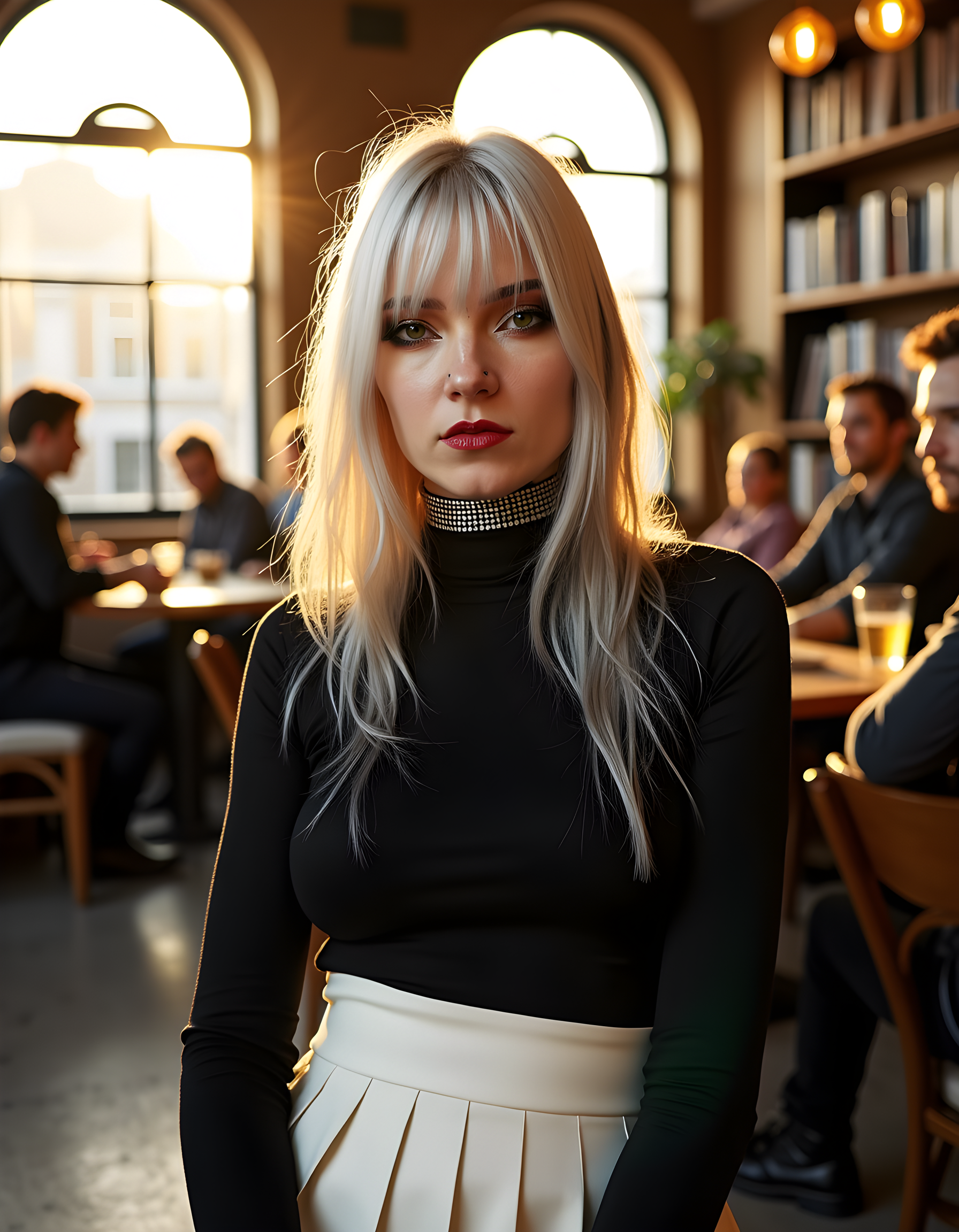 In a bustling London coffeehouse bathed in warm, golden afternoon sunlight streaming through tall, arched windows, AL3XD, a striking woman with white hair cascading down her back, is captured in a close-up portrait. Her long bangs frame her face as she gazes intently at the camera, her closed mouth and expressive eyes conveying an enigmatic air. A smattering of freckles adorns her nose, and her lips are painted a bold, vibrant red, matching the English text that reads \"London\" delicately tattooed below her lower lip. Her outfit is a mix of modern sophistication _ a black turtleneck paired with a high-waisted, pleated, white skirt _ accessorized with an edgy silver choker and chunky boots. The background is a blurred tapestry of coffee cups, books, and Londoners engaged in animated conversations, adding to the energetic atmosphere that contrasts with her still, contemplative pose.