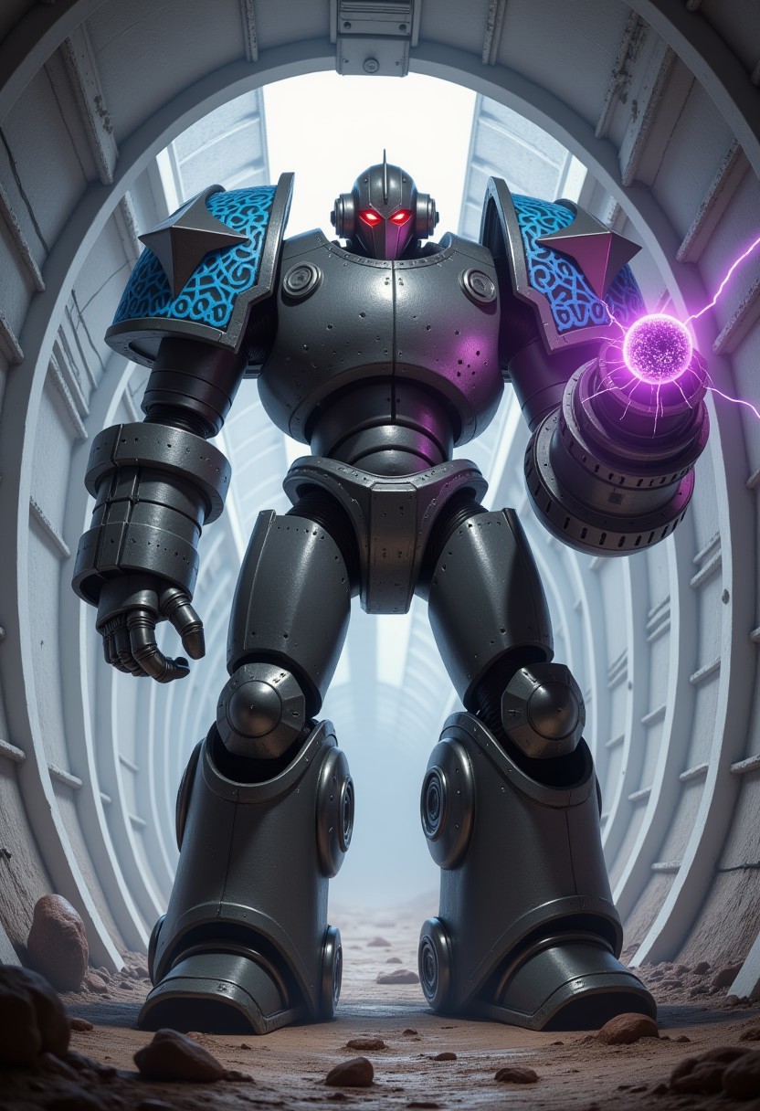In a tubular tunnel with white metal walls and high ceilings a large iron golem stands. It is heavily armored and bulky, made of gunmetal colored steel with a blue pearlescent filigree. It's right arm is some kind of cannon, with a glowing purple orb crackling with energy on the end of it. It's eyes glow with menacing red light.