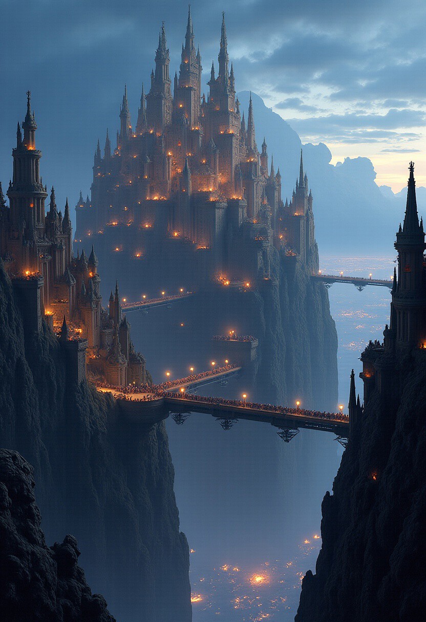 medieval fantasy, A city of towers that rises from a cliff above a vast chasm. The towers are of different heights, shapes, and colors, some reaching the clouds, some barely standing. The city is lit by magical lights of various hues, creating a dazzling spectacle at night. Bridges, cables, and flying vehicles connect the towers, forming a complex network of transportation. The city is home to people of many races, cultures, and backgrounds, who live in different districts and levels of the towers. The city is a hub of commerce, politics, and magic, but also a place of danger, intrigue, and mystery.