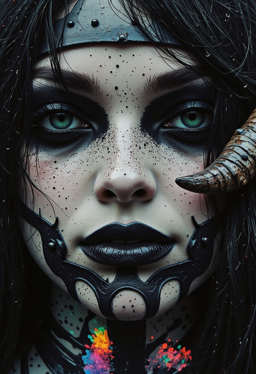 nistyle, monochrome Manga Sketch, extreme Closeup, a ancient ethereal Spirit with horns, Killing Gaze smile, eerie, eyes Shrouded in darkness, hyperdetailed manga sketch style, White chin-tattoo with bleached vibrant colorful neon color Highlights, grey, and white color grading. Translucent deep blue Backdrop with Glitch effects in another contrast application
