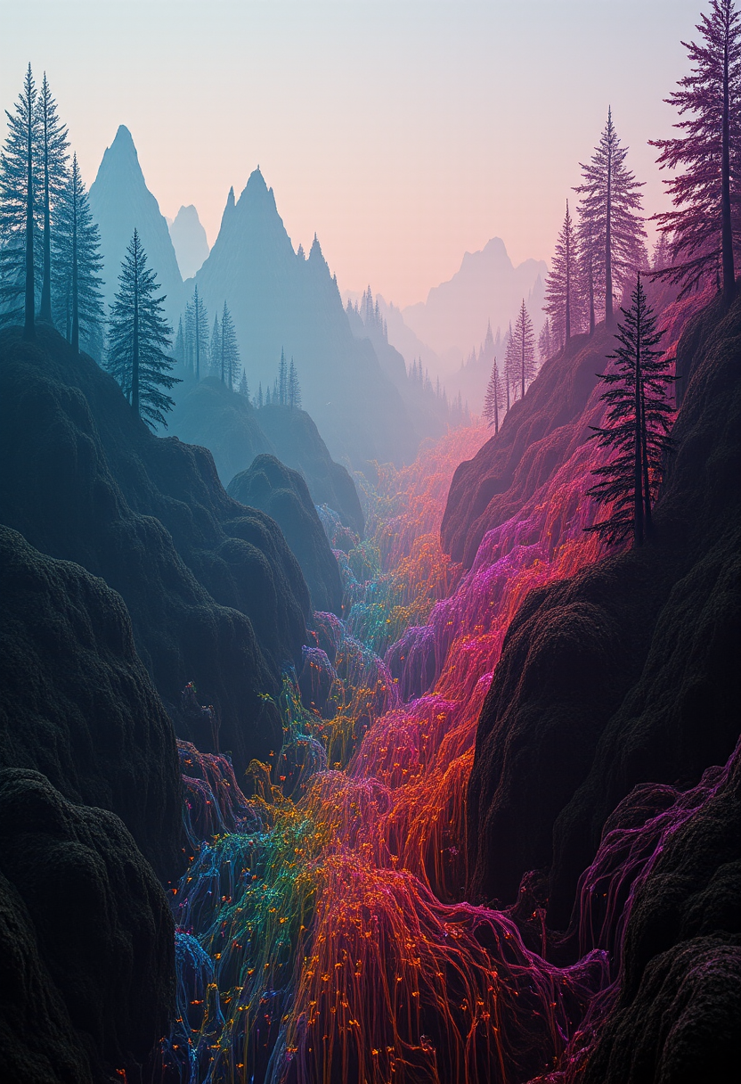 In the realm of double exposures, two worlds collide in a mesmerizing dance of vibrant hues and fluid forms. The first layer brings forth towering mountains and dense pine trees bathed in an otherworldly twilight, their peaks reaching towards an endless sky painted with shades of indigo. Upon this surreal backdrop, wispy strands of color swirl through the air like curtains drawn aside to reveal the second layer: a serene silhouette of swaying plants, their shadows creating intricate patterns that merge seamlessly with the abstract shapes within the mountainside. The harmony of these two worlds blurs the line between reality and dream, as colors from each layer intermingle in mesmerizing transitions. Lush greens from the forest meet soft pinks and purples of the plant silhouette, while rich gold hues light up the shadows between the rocks, all merging into a symphony of radiant pigments. The fluidity of the abstract forms combines with the sharp edges of the mountain range to create an unparalleled sense of depth and dimension. The lighting is ethereal, casting a warm golden glow upon this fantastical scene that emanates from within. As shadows dance between the objects, they highlight the intricate details of both worlds, revealing hidden secrets tucked away in every crevice and curve. This double exposure presents a visual paradox - both chaotic and orderly, dreamlike yet grounded in reality - leaving the viewer captivated by its enigmatic beauty. The resulting image is a breathtaking homage to the power of duality and the limitless potential of artistic expression. ,<lora:flux/fav/3d_Abstract_Op-Art-000005.safetensors:1.0:1.0>