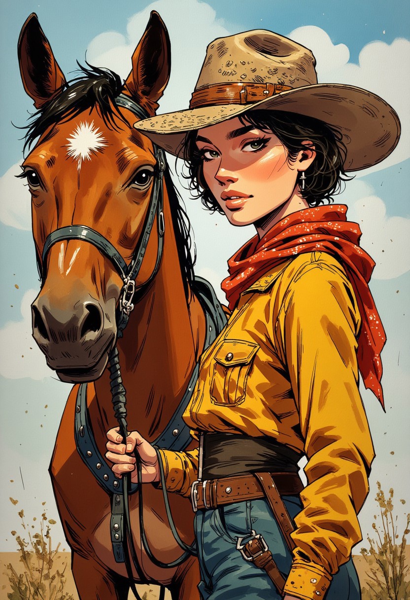 f4nt4st1c ,A stunning impressionist oil painting on canvas, capturing the essence of the American cowgirl in his natural environment. The cowgirl, adorned with a weathered leather hat and a red bandana, stands proudly beside his horse, holding a lasso. The brushstrokes create a dynamic texture and movement in the scene, bringing it to life. This highly imaginative piece blends digital surrealism and fantasy art, focusing on vibrant, luminous colors and a dreamlike atmosphere. The human features merge with the