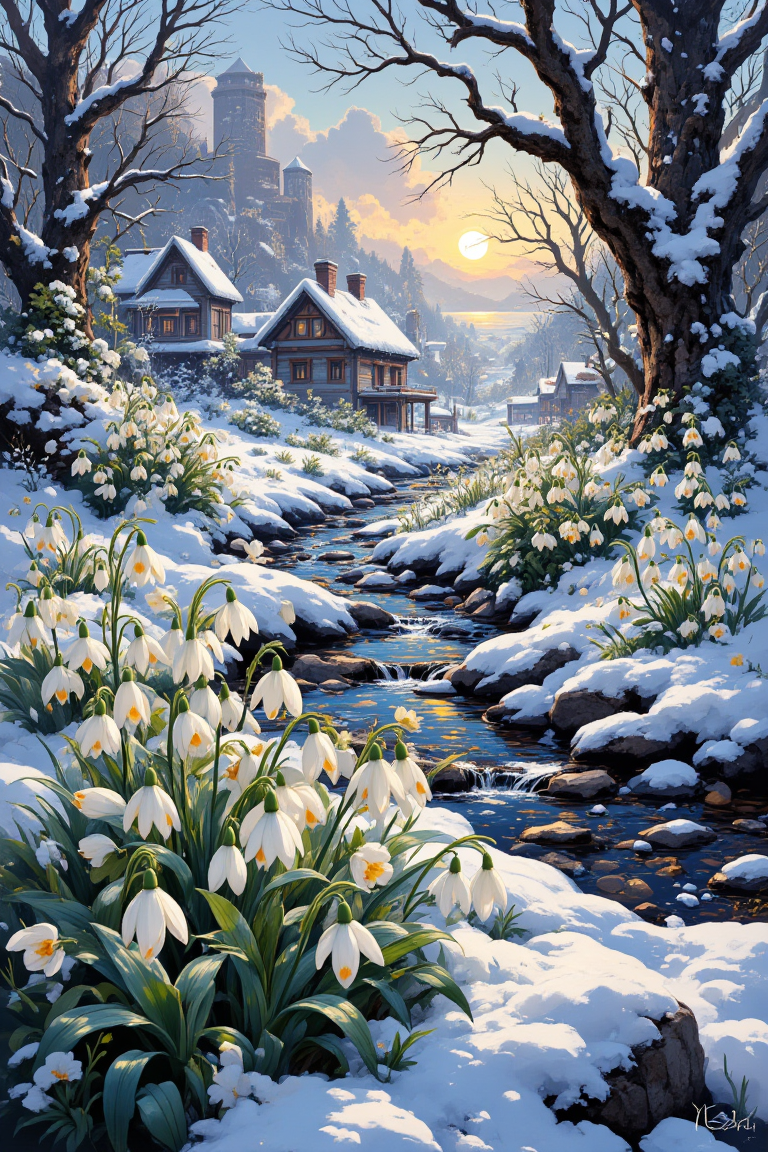 aidmafluxpro1.1 A serene and vibrant scene unfolds as the first light of dawn creeps over the horizon. A blanket of freshly fallen snow glistens in the early morning light, slowly melting away to reveal hidden streams running gently through the landscape. Amidst this awakening, delicate snowdrops burst forth with tiny white petals and bright yellow centers, their gentle sway a symphony of color against the soft blue sky.