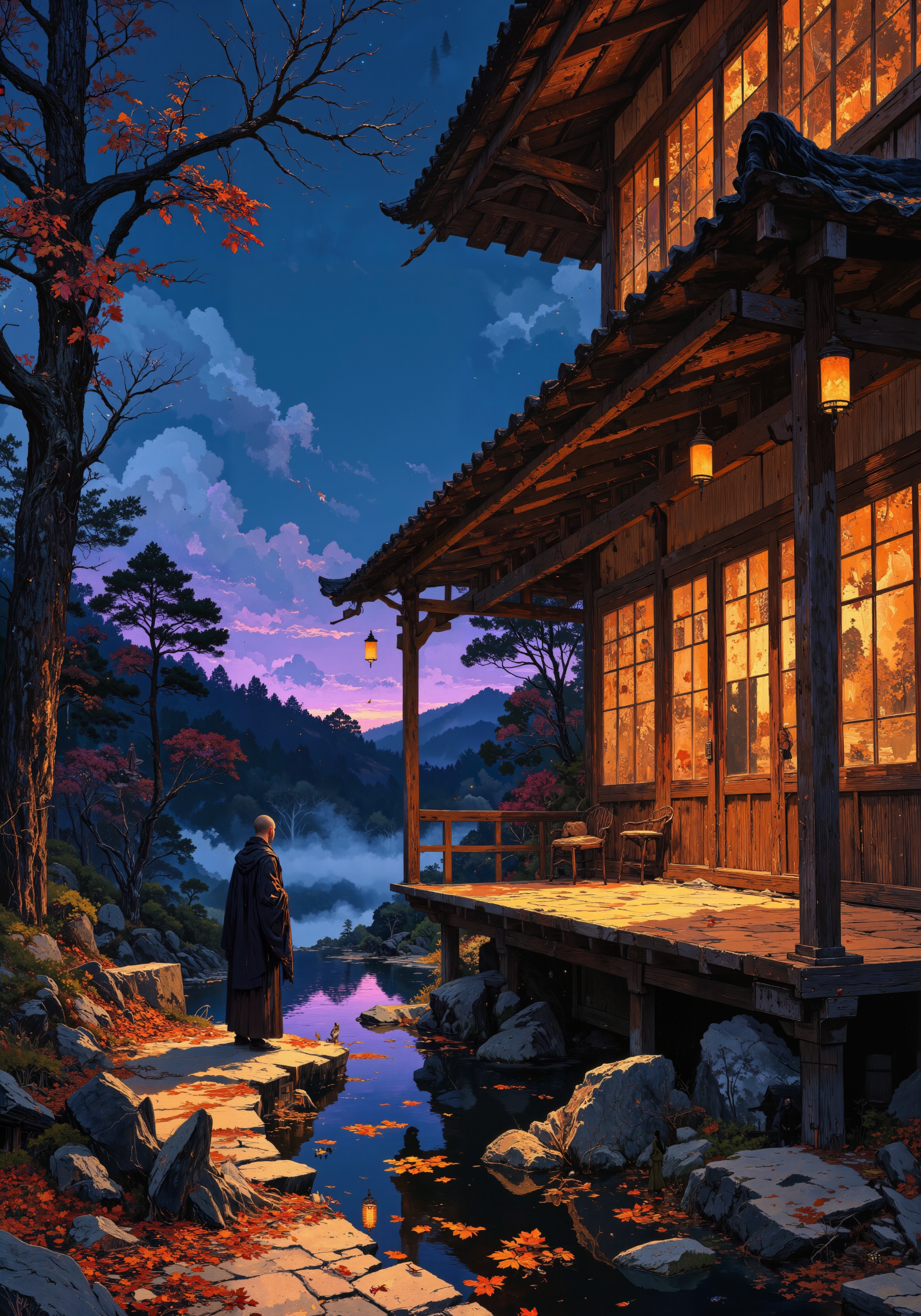 A nihonga-style painting depicting the ephemeral beauty of twilight over a rural ryokan inn, rendered on gold-leafed washi paper with traditional mineral pigments. Subtle gradations of indigo and violet wash across the sky, while amber lantern light spills from shoji screens onto the veranda. A solitary monk pauses on a stone path, contemplating fallen maple leaves floating on a koi pond's surface. Mist rises between distant pines, embodying the yugen concept of profound mystery. The composition employs intentional asymmetry and ma (negative space), with delicate brushwork capturing the texture of weathered wooden beams and the rippling water. Miniature seasonal detailsâpersimmons hanging from a bare branch, a single cricketâsuggest the transition from autumn to winter, evoking mono no aware (pathos of impermanence). The scene blends meticulous architectural precision with atmospheric suggestion, executed with refined shibui aesthetics of restrained elegance. <lora:ck-shadow-circuit-000021:0.4> <lora:FLUX-daubrez-DB4RZ:0.7> <lora:Classic_Anime_Colors:0.2> <lora:New_Fantasy_CoreV4_FLUX:0.4> <lora:boFLUX Double Exposure Magic v2:0.3> <lora:flux_dev:1>
