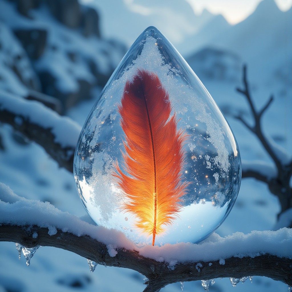 Improved cinematic photo, 35mm photograph, film, professional, 4k, highly detailed, aidmaMJ6.1, A frozen droplet encasing a fiery phoenix feather, The droplet is a smooth, perfectly rounded sphere of ice, with faint frost patterns spreading across its surface like delicate lace. Inside the droplet, a single phoenix feather is suspended in mid-air, glowing with vibrant hues of red, orange, and gold, as though it’s aflame. Tiny embers seem to spark and flicker from the feather, their light softly illuminating the icy interior of the droplet. The surface of the ice droplet glistens under a cold, pale light, reflecting the surrounding environment, which hints at a stark, frozen tundra with snowy terrain and distant icy peaks. The contrast between the fiery, warm tones of the feather and the cold, crystalline blue of the ice creates a stunning visual tension. The droplet is perched delicately on a snow-covered branch, with tiny icicles hanging from the edges, adding to the wintry atmosphere. The composition captures a moment of profound beauty and contradiction, evoking themes of resilience, harmony, and the coexistence of fire and ice in a surreal, magical setting.