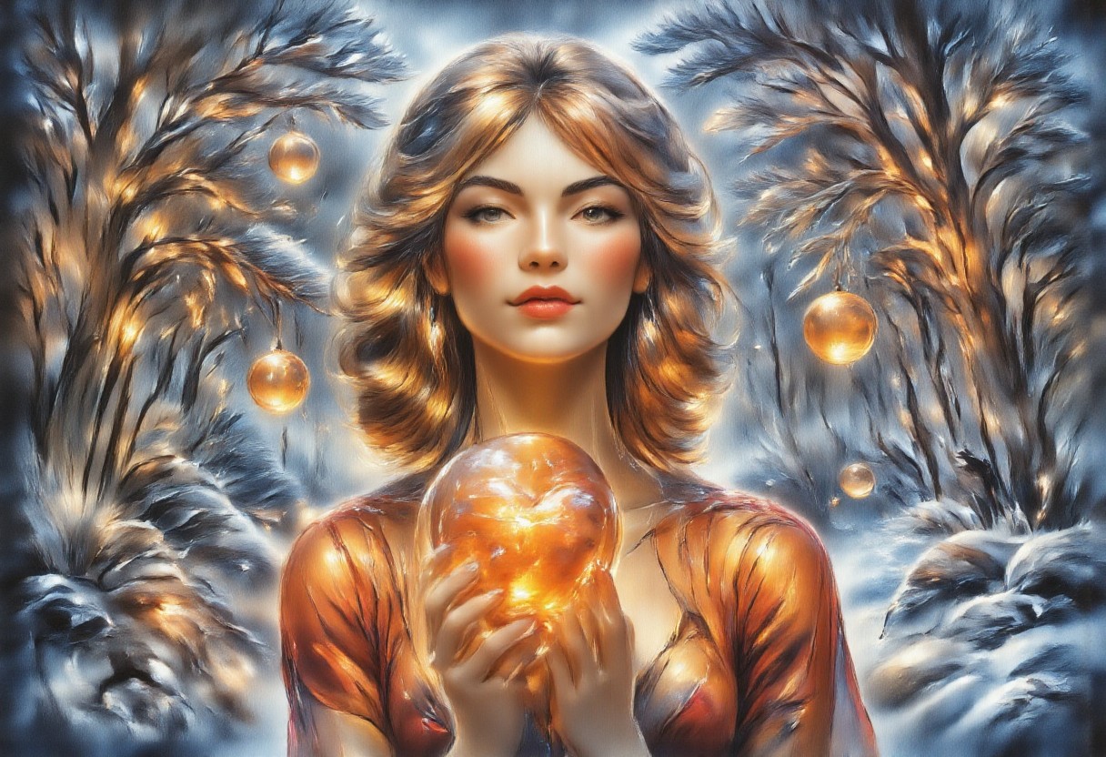 Valentine's Day theme On Valentine's Day, we present a realistic scene that shows a woman with red lips, short blonde hair flowing down, and half-closed eyes. She holds a glowing glass ball in the shape of a broken heart and seems to be praying, being behind frosted glass, on which water droplets can be seen. Her face is completely covered in frost, giving the impression that she is inside the stage. The whole painting is made in the technique of double exposure: a forest behind textured double frosted glass with obvious water drops covers the entire canvas. Frosty vibrations created with the help of double frosted glass effects create an atmosphere of fabulousness and mystery. A 3D textured brush stroke, dark background, and shades of white, red, black, gold, blue, and bronze inspired by nature create a harmonious mix of colors. The pastel color palette, the most free watercolors and whimsical natural motifs give the picture a unique charm and originality. Realism and ink painting give it a special charm.