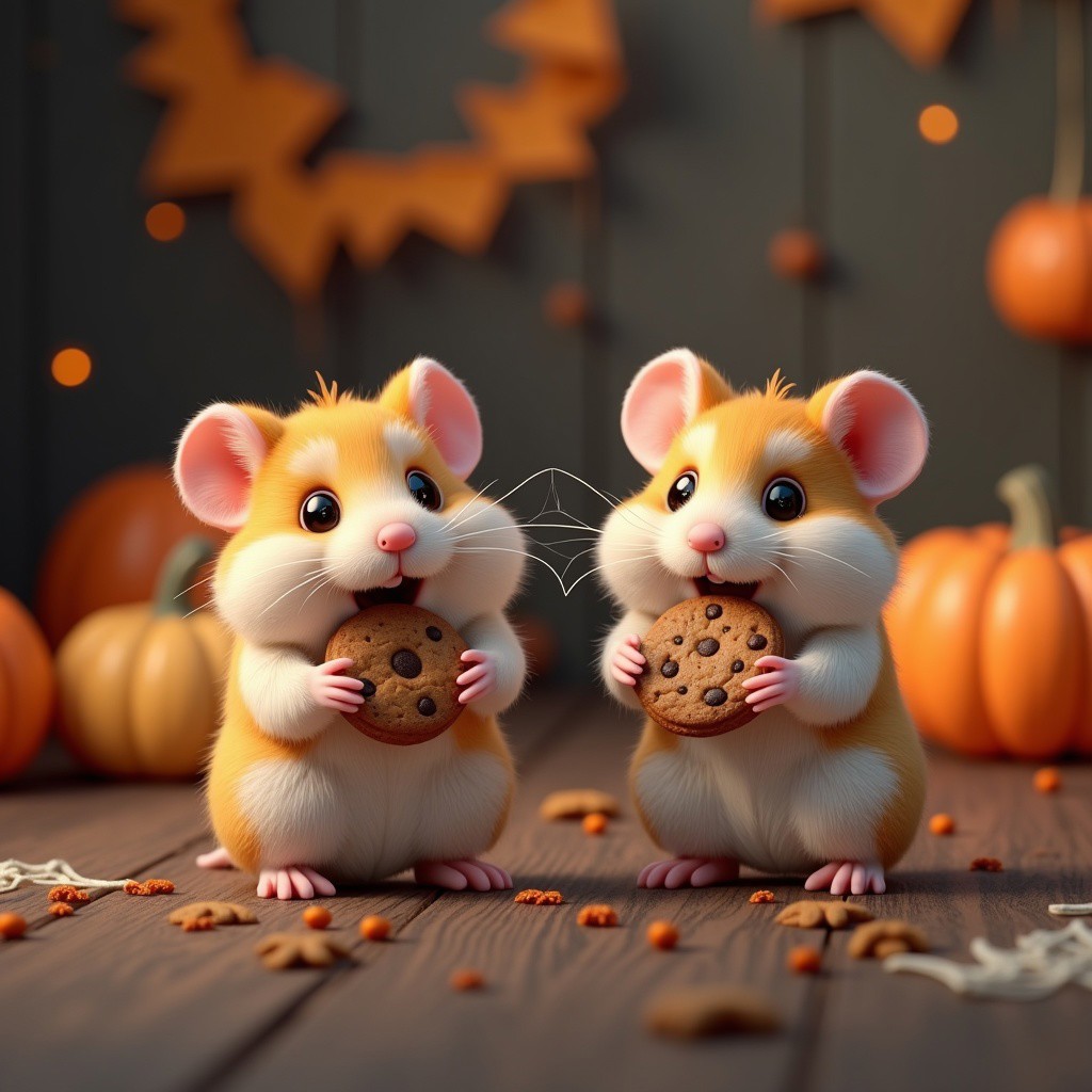 a hamster with cheeks stuffed with cookies, 2 hamsters, halloween party, cute, adorable, fluffy, small animals, whimsical, (best quality,4k,8k,highres,masterpiece:1.2),ultra-detailed,(realistic,photorealistic,photo-realistic:1.37),3d, detailed fur texture, natural lighting, vibrant colors, cute expression, playful, cozy interior, festive decorations, pumpkins, cobwebs, spooky atmosphere, soft focus