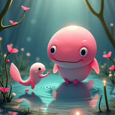A cartoon illustration capturing a whimsical underwater encounter in a heart-shaped pond. In this enchanting scene, a minuscule, semi-white colored tadpole with a disproportionately large, expressive head is depicted with a distinctive flagellum-like tail—a thin, whip-like appendage that moves with fluid, dynamic grace and remains free of any extra fins or embellishments. This tiny tadpole tenderly reaches out toward a majestic, balloon-like fugu rendered in a vibrant pink hue, its plump, perfectly rounded form dominating the composition with a smooth, seamless surface. The heart-shaped pond is bordered by clusters of lush water plants with gently swaying fronds, and along its edge, unique pond-side plants shaped like slender candles rise, their tapering silhouettes evoking a soft, magical glow. These candle-like plants cast delicate, flickering reflections on the water, enhancing the overall enchanting atmosphere. This imaginative composition blends affectionate charm with playful contrasts in scale and fantastical detail, inviting viewers into a mesmerizing underwater realm where tender moments and whimsical design converge.