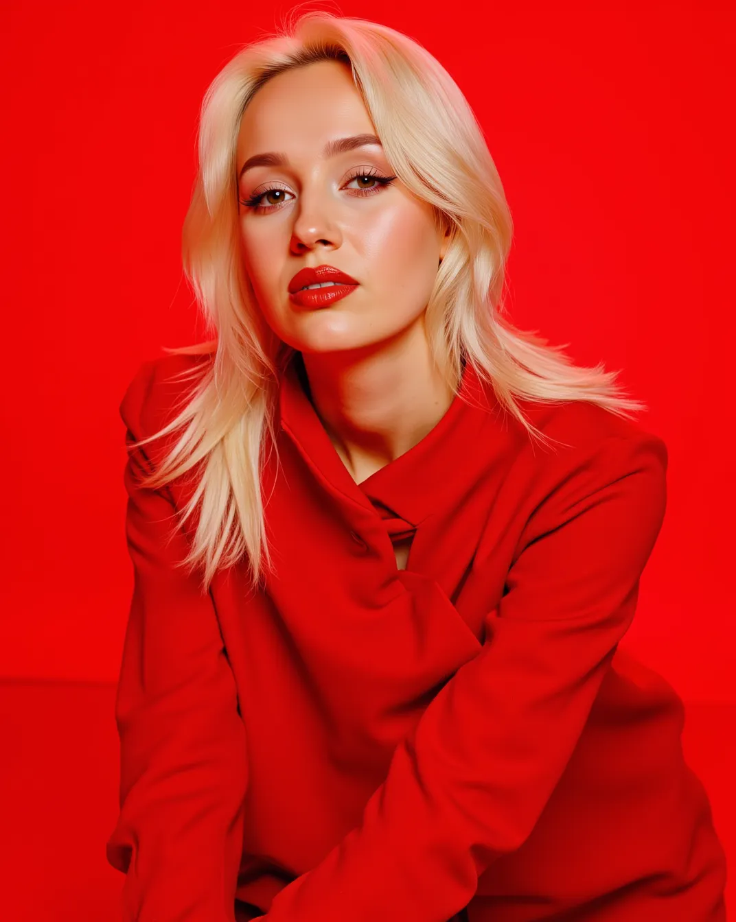 photoshoot of Klava Koka, female, woman, solo, blonde hair, red fashion clothes, red studio background, extreme close up shot.