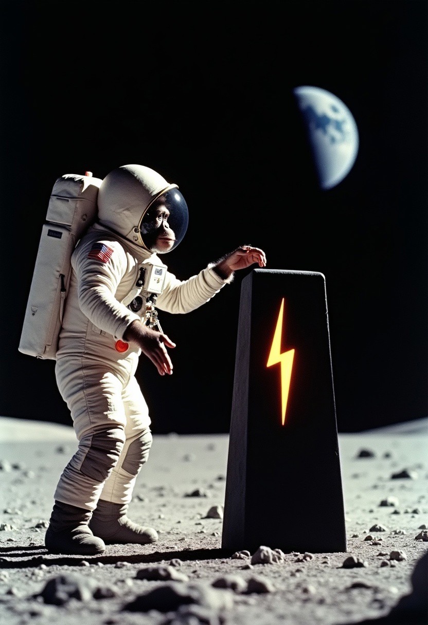 The realistic vintage NASA photograph depicts a close-up view of an Apollo astronaut standing on the surface of the moon. The astronaut’s face is visible through the clear visor. The astronaut is a chimpanzee. The chimpanzee astronaut is standing next to a tall black monolith from 2001 A Space Odyssey. There is a yellow lightning symbol on the black monolith. The planet earth is visible in the black sky behind the astronaut and the monolith. The chimpanzee astronaut is reaching his hand out toward the square monolith.