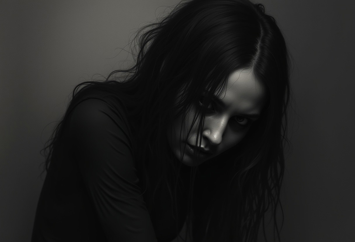 Capture the essence of (sadness:1.5) in a (gothic female:1.3) figure, (lonely:1.4) in a (dark:1.5) monochrome setting, (haunting expression:1.3), surrounded by (shadows:1.2), inspired by (Edvard Munch:1.2) and (gothic art:1.3)