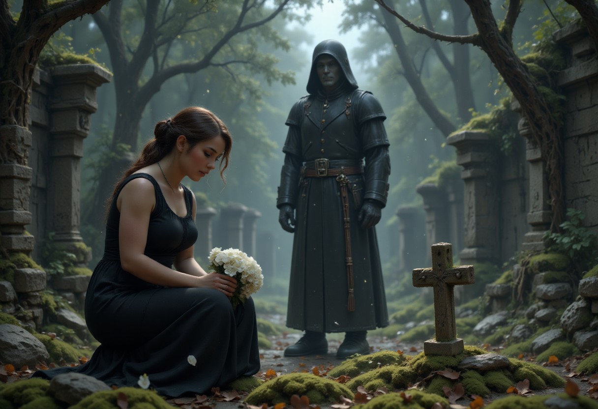 Mournful widow at one gravestone in a serene cemetery. She wears a simple, elegant black dress, kneeling with white flowers in hand. Her expression shows quiet sorrow, with a single tear on her cheek. Ghostly figure of a man in a military uniform standing behind her, his face conveying comfort and love. The entire image evokes the sense that love is eternal.