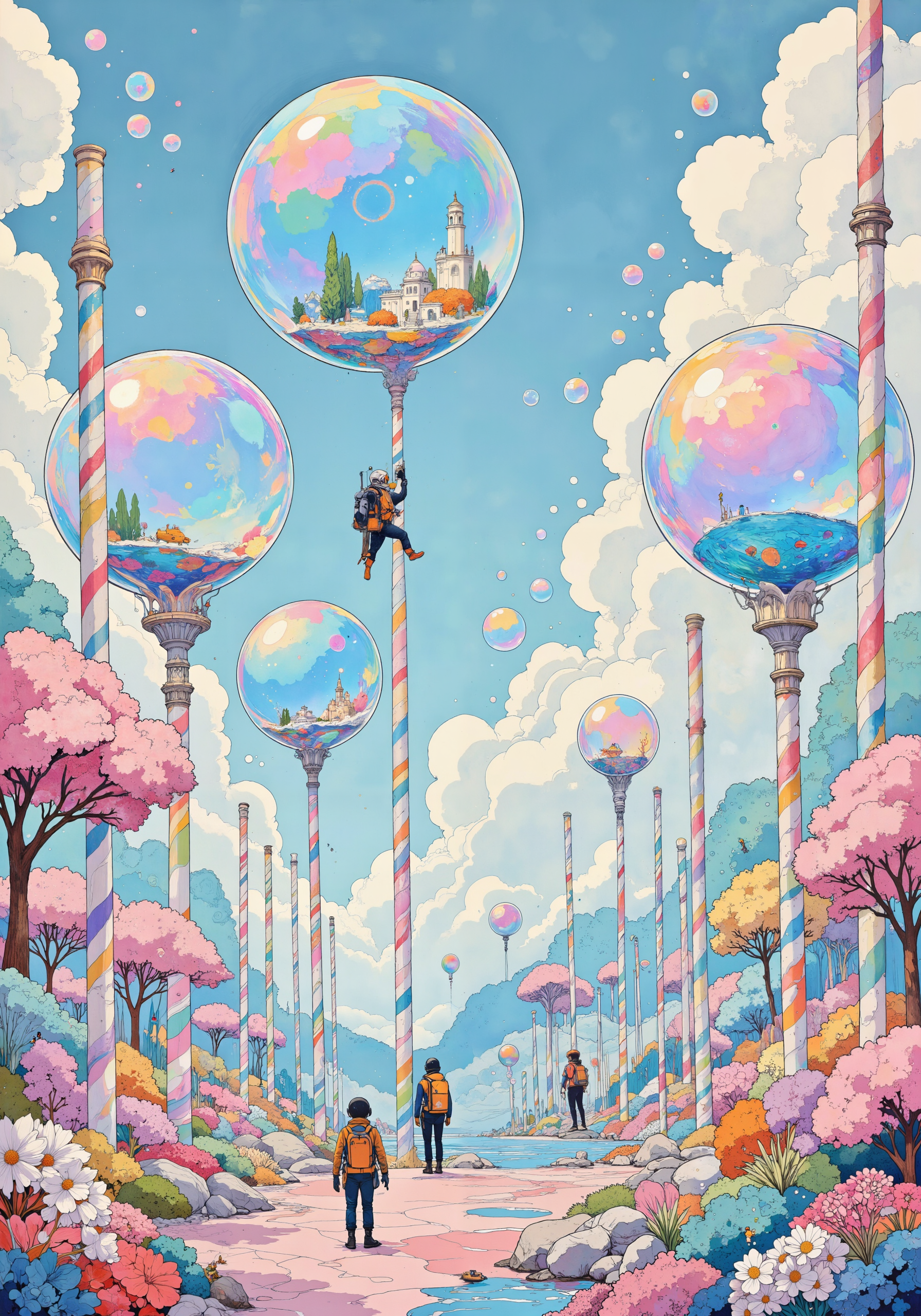 Colossal iridescent soap bubbles float majestically in a surreal garden, their translucent surfaces reflecting prismatic rainbows. Miniature explorers in vibrant diving suits navigate between the enormous spheres, using tiny submarines and jetpacks. The bubbles house intricate ecosystems: some contain miniature coral reefs, others floating jellyfish forests or swirling nebulas. Surrounding the bubbles, gargantuan candy-striped straws rise like skyscrapers, their tips releasing streams of shimmering bubbles. The landscape below is a patchwork of pastel-colored foam, dotted with whimsical lollipop trees and cotton candy bushes. Magical sparkles and mist add an ethereal atmosphere. Soft, diffused lighting creates a dreamy ambiance. 8K resolution, hyper-detailed, whimsical illustration style, vibrant colors. <lora:Illustration concept V1:0.6> <lora:Memadukan_Brush_Strokes_of_Fineart:0.5> <lora:flux_dev:1>