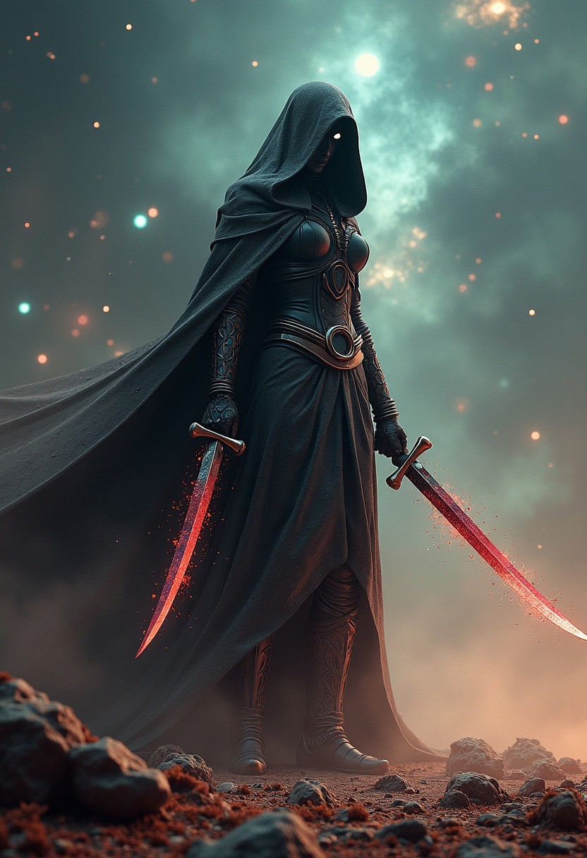 a deadly assassin woman whose cloak is made of swirling stardust and nebulae, wielding blades forged from solidified cosmic dust, her face hidden in shadows, only piercing eyes visible, standing on a desolate asteroid in deep space, distant galaxies and nebulae forming the background, sense of cosmic power and silent menace, space opera, dark fantasy, surrealism, photorealistic, octane render, 8k, dramatic lighting, mysterious silhouette, cosmic horror element