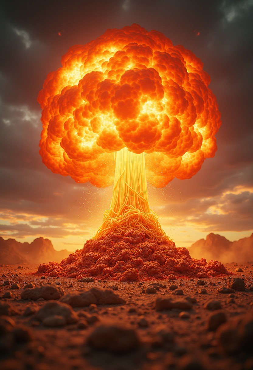 A spaghetti Bolognese bomb exploding on a desolate planet's surface, spaghetti explosion, tomato sauce with sliced mushrooms pouring out in a ring of nuclear fire, total devastation by tasty pasta dish