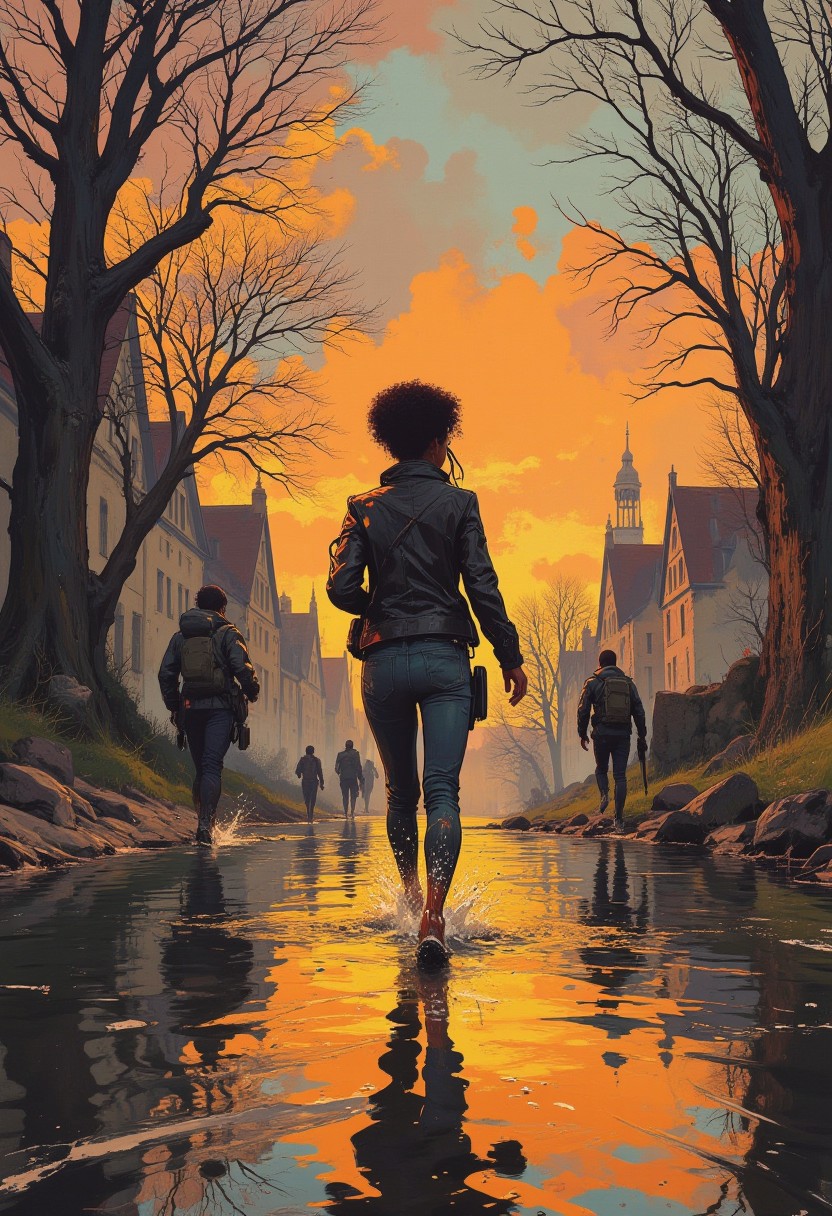 European River side by sunrise, reflection, a slim black woman, Afro Hairdo, Black leather jacket, jeans running across low water seen from the front, (((view from high above, directly towards the woman))), the woman is running fast in low water towards the viewer, 2men armed with assault rifles are running after her in the distance. shadows, shadow trees, soft pastell colors, best quality, realistic, whimsical, fantastic, splash art, intricate detailed, hyperdetailed, maximalist style, photorealistic, concept art, sharp focus, harmony, serenity, tranquility, mysterious glow,ambient occlusion, cozy ambient lighting, dynamic lighting. a masterpiece, award winning, DB4RZ, DB4RZ style painting, NeoPigma, in the style of cksc, anime, cyberpunk