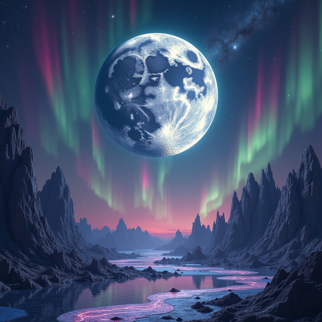 unusual moon hanging low in a surreal, otherworldly night sky. The moon is not the typical round shape; instead, it has intricate geometric patterns glowing softly in shades of silver, blue, and violet. The sky around it is alive with swirling galaxies, shimmering stars, and auroras in vibrant, unexpected colors like gold, emerald, and crimson. Below the moon, a mysterious, alien landscape stretches out, with jagged crystalline mountains and glowing lakes that mirror the bizarre beauty of the celestial scene above, 16k resolution 16k resolution, 64 megapixels, dynamic lighting