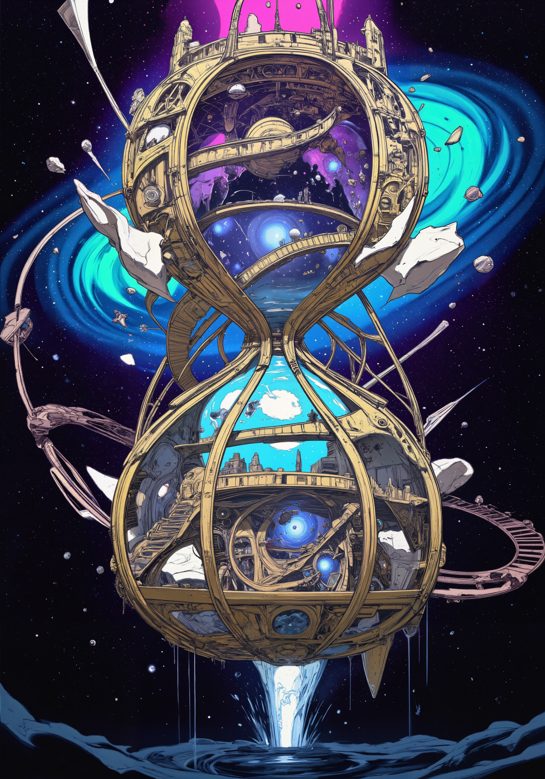Ethereal Chronosphere, a colossal hourglass-shaped structure suspended in a swirling temporal vortex. Intricate clockwork mechanisms of gleaming brass and translucent crystal form its skeletal framework. Countless miniature galaxies and nebulae swirl within its bulbs, each containing entire civilizations frozen in different epochs. Spiraling staircases and floating platforms allow observation of the time-locked realms. Shimmering energy fields maintain the delicate balance of temporal flux. Surrounding the Chronosphere, fragments of various architectural styles from throughout history orbit in a mesmerizing dance. Vibrant auroras of chrono-energy illuminate the scene in otherworldly hues. Hyper-detailed digital art, volumetric lighting, 8K resolution, surrealist influence <lora:Illustration concept Variant 3A:0.6> <lora:D-ART-Flux1:0.6> <lora:NeonFantasyPrimeFLUX-000049:0.3> <lora:Comic book opus 3:0.7> <lora:Retrocom1_for_Flux:0.8> <lora:flux_dev:1>