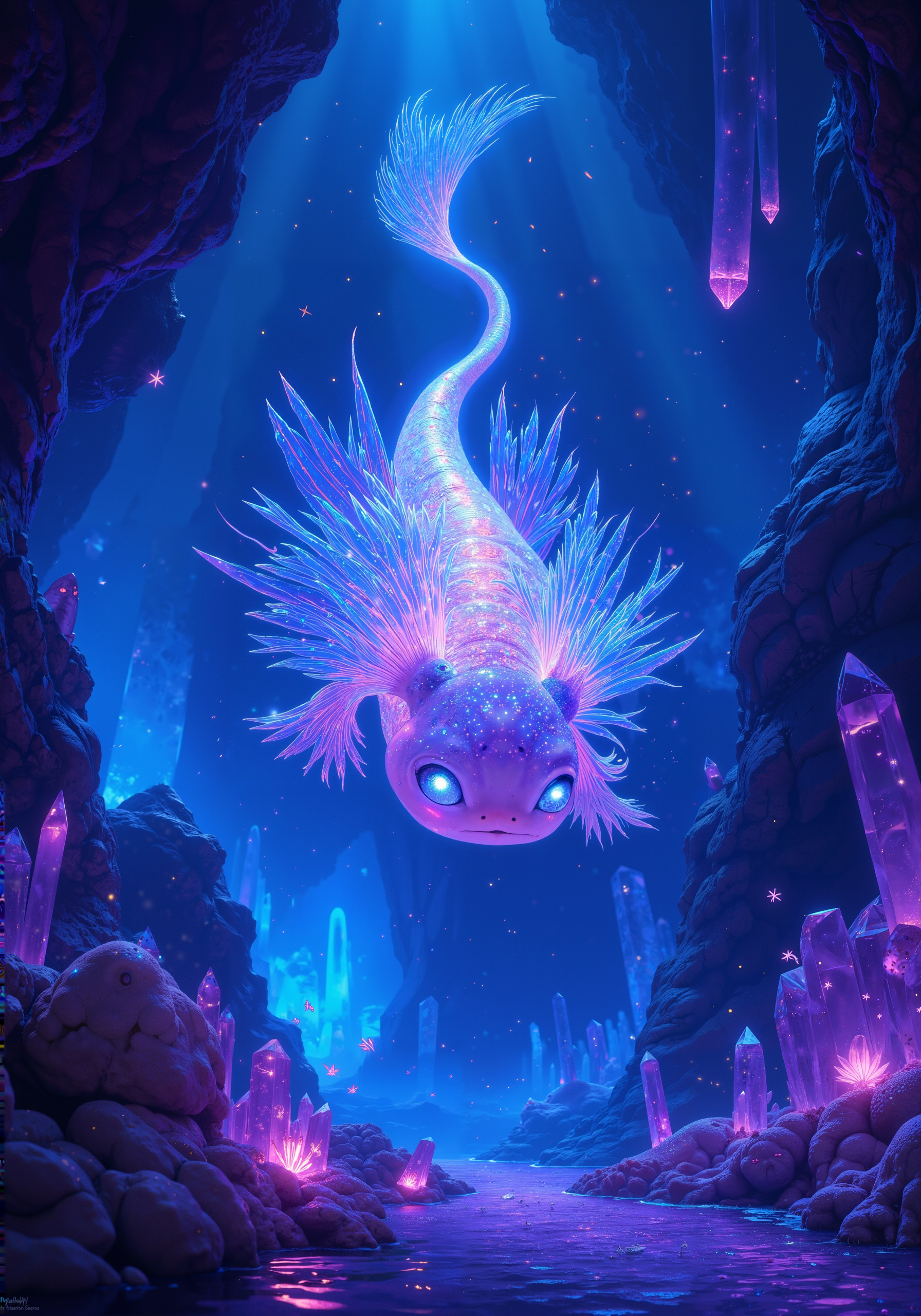 A colossal, bioluminescent axolotl glides through a subterranean crystal cavern, its translucent body pulsating with ethereal blue and purple hues. Delicate, feather-like external gills fan out like a royal collar, shimmering with bioluminescent speckles. Its large, innocent eyes reflect the dazzling array of quartz and amethyst formations surrounding it. Iridescent scales catch and refract light, creating a mesmerizing display of colors. The axolotl's elongated tail swirls gracefully, leaving a trail of glowing particles in its wake. Crystal-clear underground streams weave through the cavern, their surfaces mirroring the creature's radiant form. Tiny, luminous cave-dwelling organisms float around the axolotl, accentuating its immense size. The scene is rendered in a hyper-realistic digital painting style, with meticulous attention to textures and lighting. 8K resolution, ray-tracing, volumetric lighting enhances the magical atmosphere of this hidden underground world. <lora:bm-goth_epoch_1:0.1> <lora:CPA:0.5> <lora:flux.1_lora_flyway_Epic-detail_v2:0.1> <lora:Sinfully_Stylish_1.0_Flux:0.3> <lora:MoriiMee_Gothic_Niji_Style_FLUX:0.1> <lora:flux_dev:1>