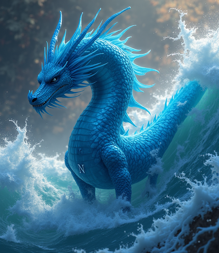 8. Neptune: The Mystical Sea Oracle text: A mystic, fluid ancient dragon warrior, cloaked in shimmering, aquatic tech scales that evoke the deep blues of Neptune, emerges from tumultuous, dreamlike waters. Rendered in a hyper-realistic digital painting style with graceful Chinese ink sweeps, the scene is drenched in dramatic, bright cinematic lighting in 4K resolution. [with text "N" on chest, ] text overlay: "Neptune" at bottom-right in a watery, flowing design.