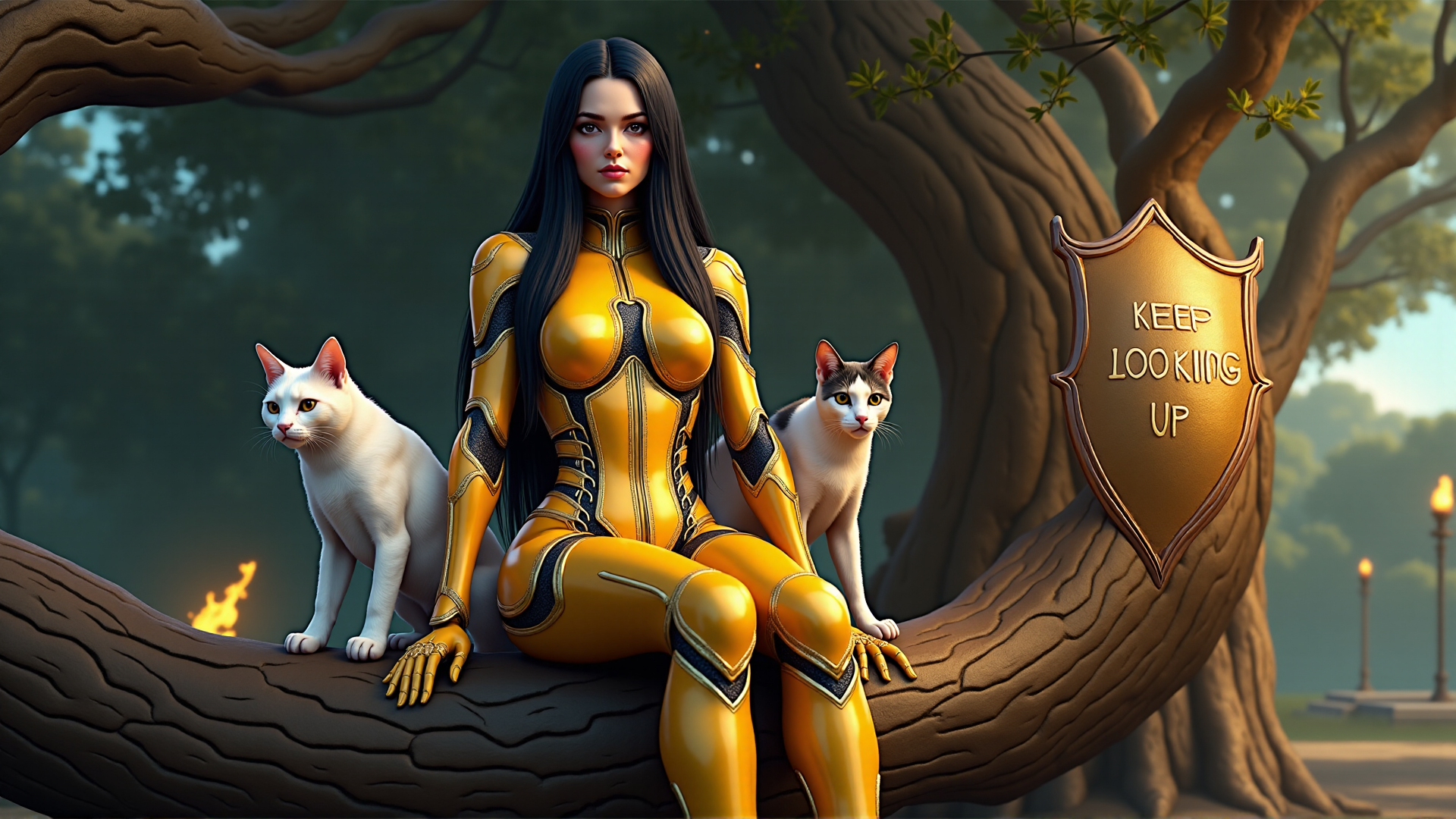 photorealistic, highly detailed, beautiful woman's head with long black hair, her face is clearly visible, on a gold (fully clothed:3) cyborg body with blue and gold trim, she's (facing the camera:3), her face and eyes and neck are normal, hands properly formed with only 4 fingers and a thumb, (neon lights outline the woman's legs and arms and encircling her midriff:3), she's (sitting on a large branch of a tree:3), the camera view (is medium wide:3), lighting is sunny daylight, the space on the ground is well lit with flaming torches, on one side of her a cyborg cat sits and on the other side of her a cyborg dog sits, she's holding a cool drink in her hand, nearby is a knight's shield on a post, in gold letters on the shield are the words "Keep Looking Up"