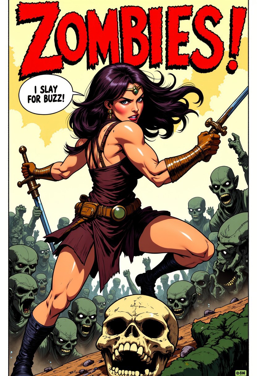 colorful realistic artwork style: A hazel-eyed, amber-haired, muscular, dark tan, female Amazon warrior, wearing bronze bracelets, black boots, burgundy armor, angry, shouting, swinging a sword at a zombie's broken skull, red lettering above her sword Zombies! large speech bubble "I slay for buzz"