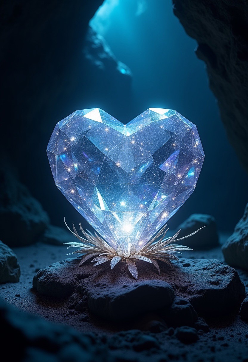 **"Deep within a mystical cavern aglow with soft, ethereal light, a heart-shaped sculpture crafted entirely from diamonds rests atop a natural pedestal of ancient stone. Each facet of the diamond heart sparkles like a constellation, refracting the surrounding glow into brilliant hues of blue, violet, and white. Intricate natural inclusions within the gem tell stories of pressure, time, and transformation, mirroring the resilience of love itself. Encircled by delicate silver leaves and a fine dusting of stardust, the heart emanates an aura of timeless elegance, as if it were the crystallized essence of passion, forged in the secret chambers of the earth and destined to illuminate the dark with its radiant beauty."**