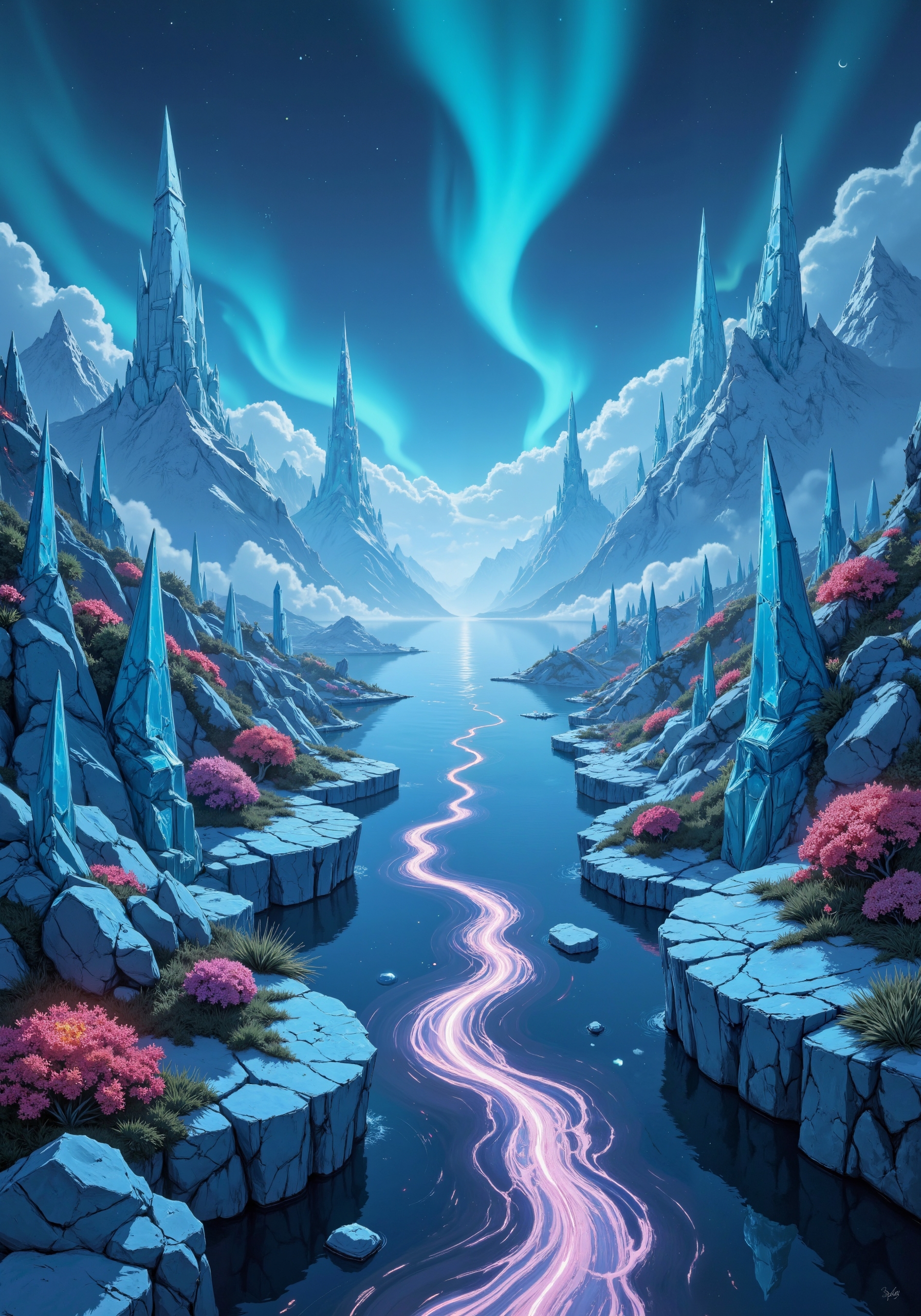 Ethereal aurora-lit tundra, vast expanse of crystalline ice formations stretching to the horizon. Towering translucent spires reflect prismatic light, creating a kaleidoscopic display. Bioluminescent flora pulsates with alien rhythms, casting an eerie glow across the frozen landscape. Floating ice platforms hover above, connected by gossamer bridges of frozen mist. Otherworldly creatures with iridescent pelts traverse the icy terrain. Swirling nebulae paint the night sky, their cosmic dance mirrored in the glassy surface below. Shimmering forcefield domes encase pockets of lush, verdant life. Plasma rivers cut through the tundra, their molten flow defying the surrounding cold. Hyper-realistic digital art, 8K resolution, volumetric lighting, ray-tracing, intricate detailing, cinematic composition. <lora:Anime realistic V2:0.7> <lora:Black illusion B:0.4> <lora:Ganin_II:0.4> <lora:flux_dev:1>