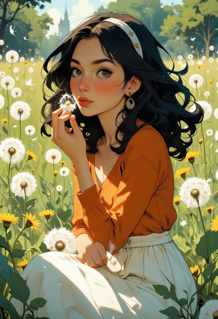 Anime art. Closeup. Scene of a girl sitting in a field of white and yellow flowers. Pretty 20 year old Egyptian girl with long black hair, and olive skin. She has a round face and very light brown eyes. She is wearing a vibrant orange top and white skirt. She is holding a dandelion up to her face. Her full lips are puckered into a circle as she blows away the dandelion petals, which are scattering in the wind. It is mid day but slightly overcast. A lush green field spotted with white and yellow dandelions comprises the background. The stiff breeze is catching her hair. The mood is serene and playful. Perfect hand. Highest quality, best quality, masterpiece.
