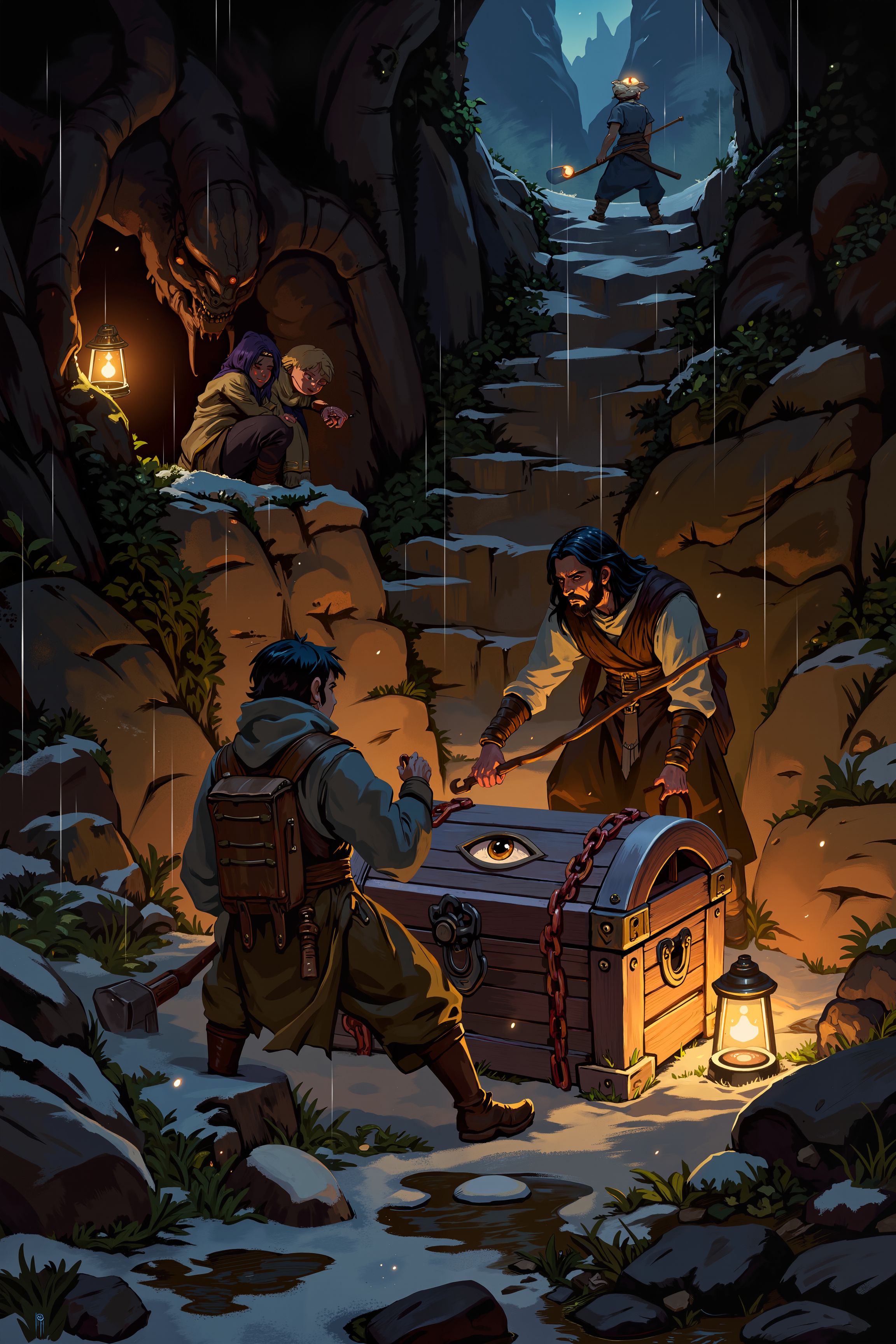 Deep beneath the surface, a group of weary adventurers digs through layers of ancient, cursed earth. Their lanterns flicker in the damp air as their shovels strike something hardâa massive, obsidian chest bound in rusted chains. A single eye, embedded in the wood, flickers open, glowing with unnatural awareness. One adventurer, sweating despite the cold, reaches forward to pry it open, while another hesitates, their instincts screaming to run. The ground beneath them shudders, as if the world itself is warning them: some things are not meant to be unearthed.<lora:XRSTYLE_FLUX:0.7><lora:RetroAnimeFluxV1:0.4><lora:MoriiMee_Gothic_Niji_Style_FLUX:0.3>