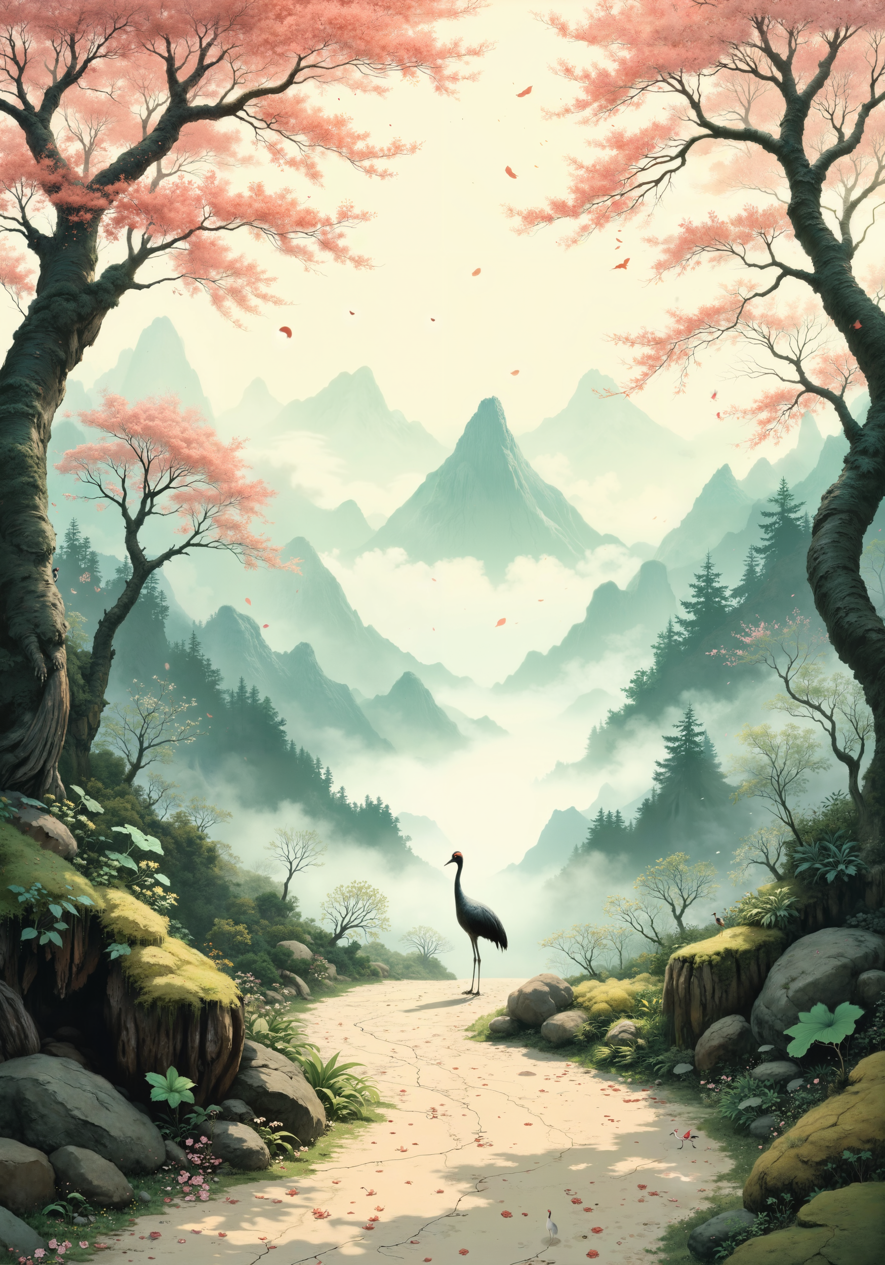 Ethereal sumi-e landscape depicting 'Komorebi' - sunlight filtering through tree leaves - in a misty mountain forest. Delicate brushstrokes on handmade washi paper create layers of atmospheric perspective with traditional mineral pigments in muted greens and earthy ochres. Cherry blossom petals scatter across a winding mountain path, embodying the concept of 'Mono no aware' - the pathos of impermanence. A solitary red-crowned crane stands in negative space, symbolizing longevity amidst the transience of seasons. The composition embraces asymmetrical balance with careful attention to 'Ma' - the meaningful emptiness between elements. Fine ink gradations (bokashi technique) suggest distant peaks emerging from clouds, creating yugen - profound mysterious beauty. Meticulous details in foreground foliage contrast with deliberately undefined spaces, inviting contemplative viewing in Muromachi period aesthetic. <lora:artilands:0.5> <lora:VividMidjourneymimic-Flux_v1.0:0.5> <lora:flux_dev:1>