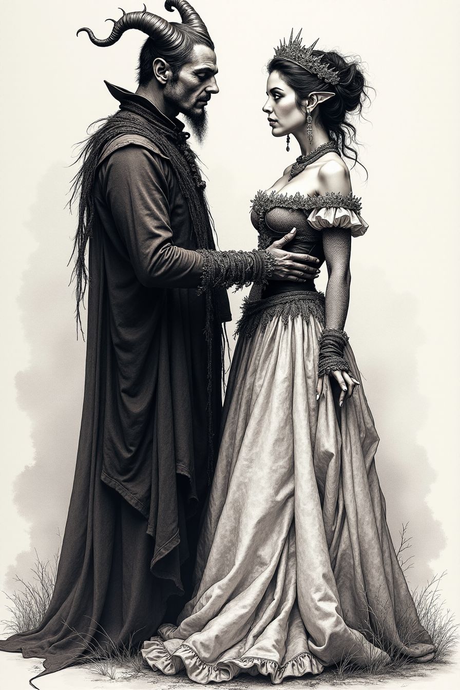 pen and ink rendition, almost as if alive, of a wicked hobgoblin and his captured lady fair, all made up in the finest silks