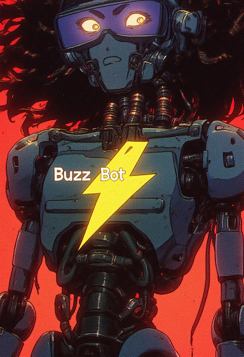 An android with visible mechanical parts that i powered by a yellow lightningbolt symbol in her chest. Text on screen "Buzz Bot" retro anime style