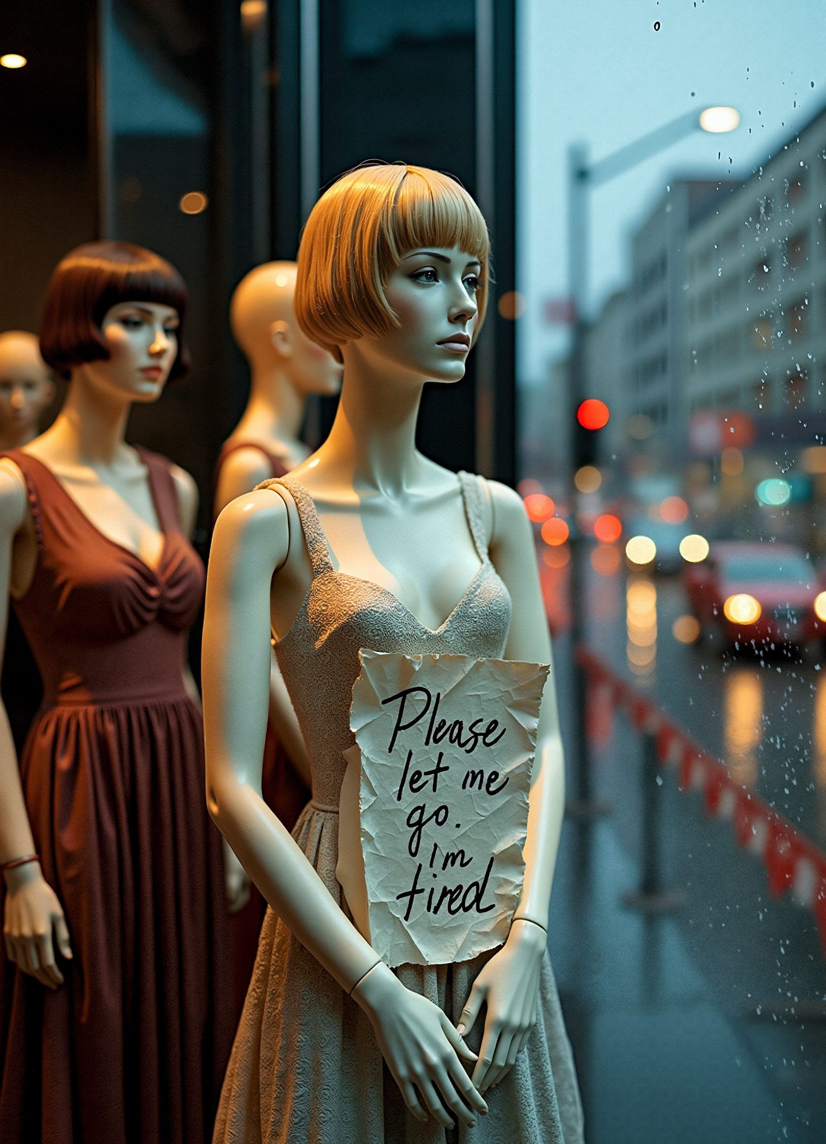 A female mannequin stands behind the glass of a clothing store window display, gazing out onto the rainy street. She is dressed in an elegant dress and wears a synthetic wig, her plastic face frozen in an expressionless stare. In her stiff hands, she holds a crumpled sheet of paper with a handwritten message: "Please, let me go. I'm tired." Around her, other mannequins pose in various stances, adorned in stylish outfits, their lifeless forms arranged as if frozen in time. The city is wrapped in twilight, and raindrops streak down the glass, distorting the reflections of neon lights and passing cars. The scene is viewed from outside, capturing the mannequin as the focal point—her silent plea trapped behind the glass. The angle of the shot adds depth, creating an eerie, almost cinematic composition. The atmosphere is melancholic, blending realism with an uncanny sense of longing.