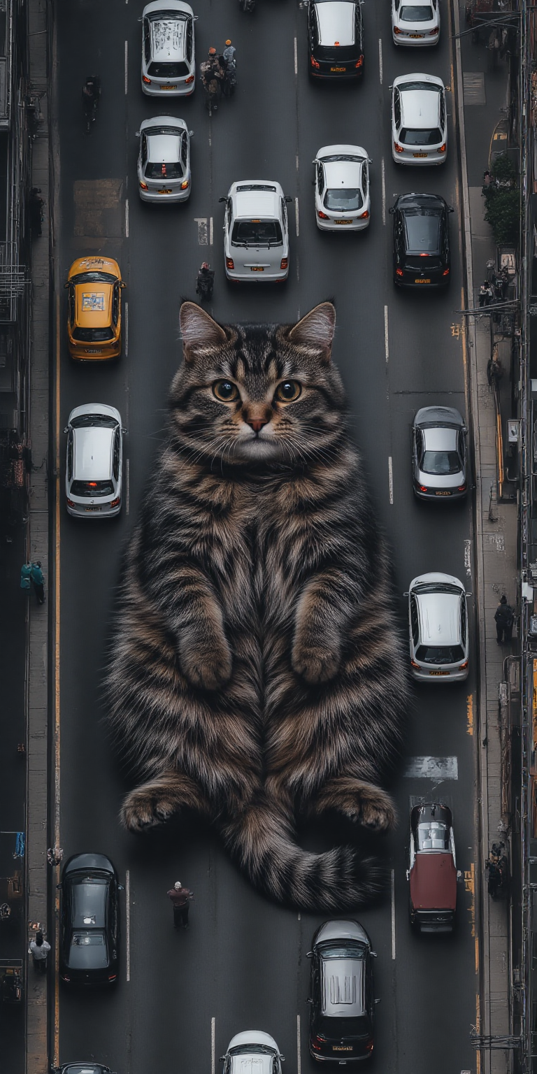 deepblack,deepblack,photo-fen,A huge cat,cute and cute,lying on the road with heavy traffic,many cars,forming a strong contrast,realism,high definition,masterpiece,