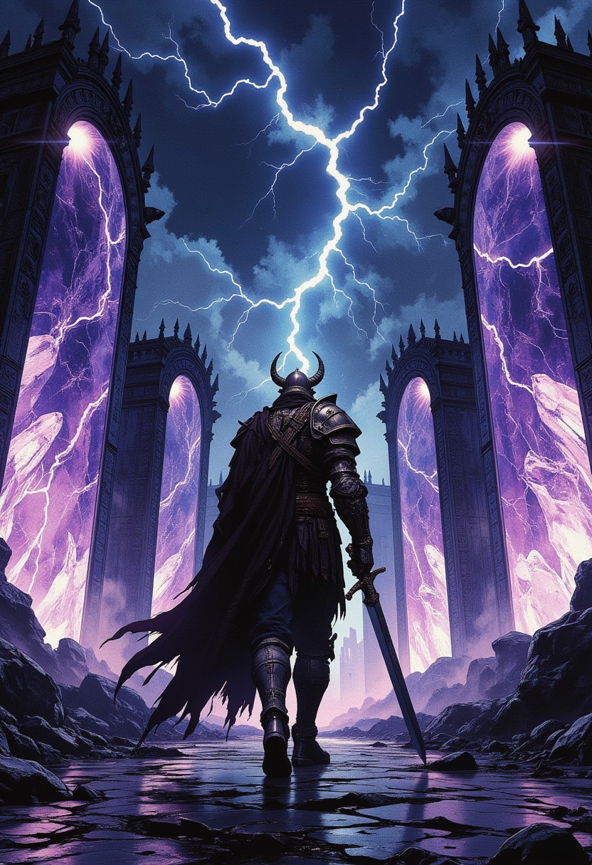 Dark fantasy scene, a massive circular formation of glowing, jagged crystal monoliths radiating eerie violet energy, each encased in blackened spiked frames. The sky above crackles with fractured lightning, deep blue arcs splitting the void-like darkness. The ground is rough, uneven stone, faintly illuminated by the ethereal glow, casting sharp elongated shadows. In the foreground, a towering warrior in heavy, battle-worn armor walks forward with his back to the viewer, mid-turn, his tattered cape billowing dramatically with his movement. His plated armor is engraved with intricate patterns, reflecting the violet light, and his horned helmet conceals his face, only a faint glow visible beneath the visor. His gauntleted hand grips the hilt of a massive greatsword, the blade still dragging slightly behind him, leaving a faint energy trail. The atmosphere is thick with tension, as if the warrior is striding toward an unknown force beyond the glowing gates. Cinematic composition, dynamic motion in the cape, low-angle shot emphasizing the warrior’s imposing presence.