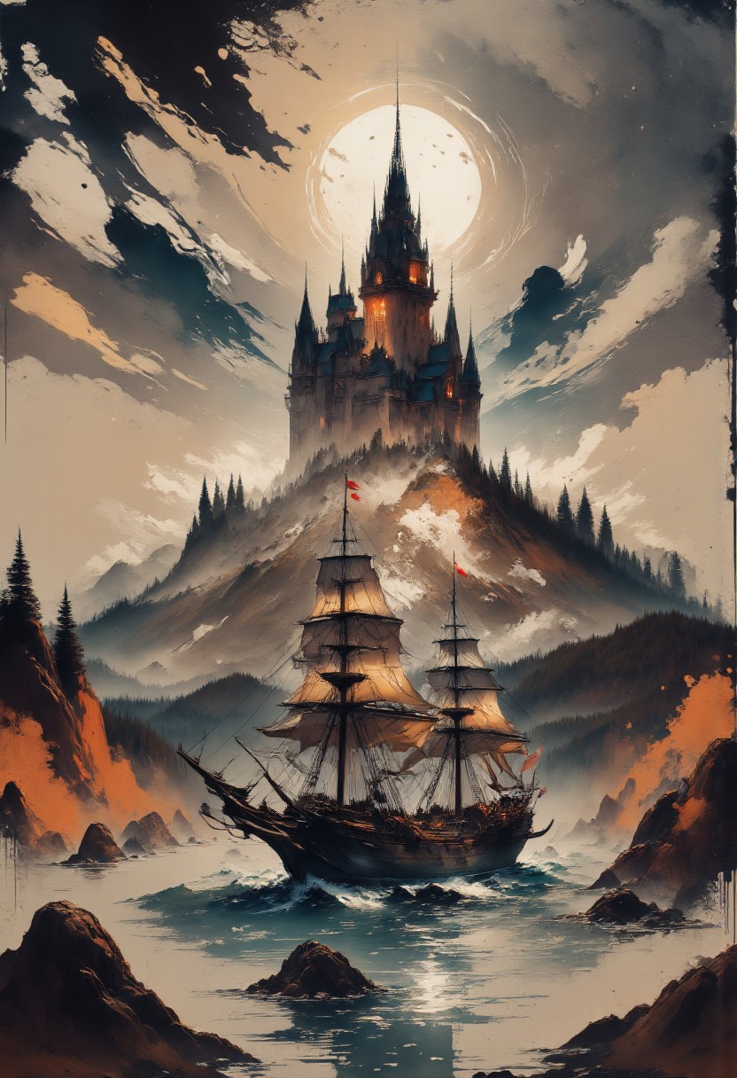castle in the sky, viking ship sailing to it, ink painting, ink art, splash, traditional media, classic painting, colorful, scenery, very aesthetic, epic, majestic, fantasy art, dreamy, perspective, moody, magical, intricate details, highly detailed, ultra-detailed, absurdres, beautiful, painterly, detailed, textural, artistic, vivid, vibrant, aidmamj6.1, aidmainkstyle