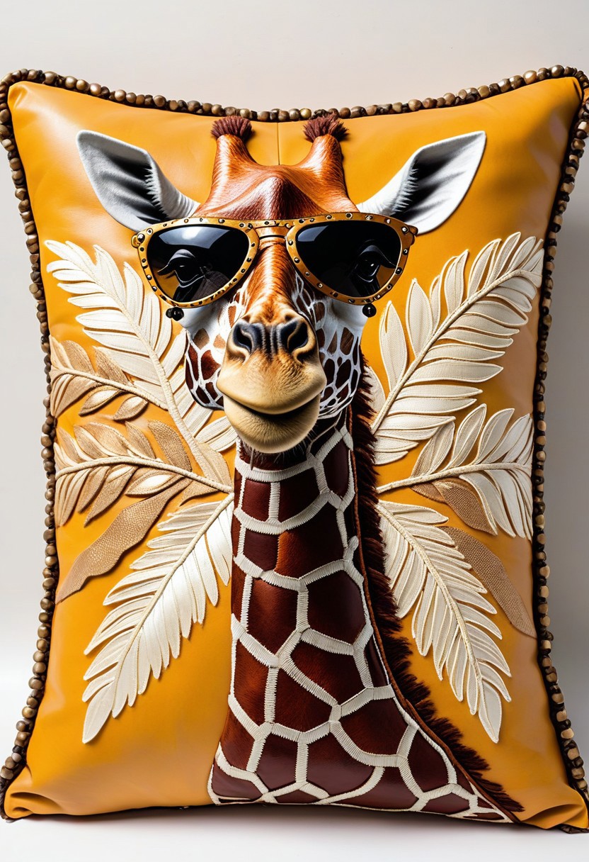 cs-l3ath3r, decorative pillow featuring a giraffe wearing sunglasses, made of decorative leather, mixed-media masterpiece, best quality, highly detailed, sharp focus, dynamic lighting,