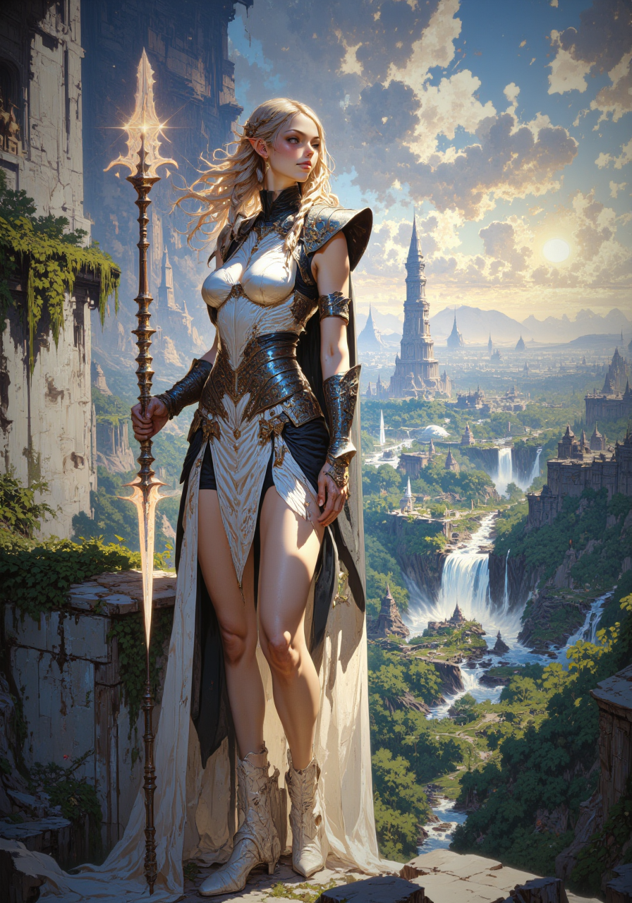 Create a stunning, highly detailed scene of a young elven woman standing atop the towering walls of a grand elven city. She is a fierce protector, her slender yet powerful frame poised with grace and readiness. Her long, flowing hair shimmers in the sunlight, adorned with delicate braids and small, natural ornaments like leaves and feathers. She holds a beautifully spear, its elegant curves glowing faintly with ancient runes, and a quiver of arrows rests at her side. Her piercing elven gaze scans the horizon, sharp and focused, searching for any sign of approaching danger. Her expression is a blend of serene beauty and unwavering determination, embodying the perfect balance of elegance and lethality. Her attire is both practical and ornate—a blend of lightweight armor made from enchanted materials, intricately designed with elven motifs, and a flowing cloak that flutters gently in the breeze. The city wall beneath her feet is a marvel of elven architecture, carved from white stone and entwined with living vines and glowing crystals. Behind her, the sprawling elven city rises in all its glory—towering spires, cascading waterfalls, and lush gardens that seem to grow seamlessly from the structures. The air is filled with the soft hum of magic and the distant sounds of nature. The atmosphere is tense yet serene, with the warm glow of the sun casting long shadows across the landscape. The horizon is vast, with dense forests and distant mountains hinting at the unknown dangers lurking beyond. The contrast between the beauty of the elven city and the lurking threat of an unseen enemy creates a powerful, evocative image. Every detail—from the texture of her armor and the glow of her bow to the intricate carvings on the city walls and the lush greenery of the surroundings—should be rendered with hyper-realistic precision, immersing the viewer in this magical, perilous world