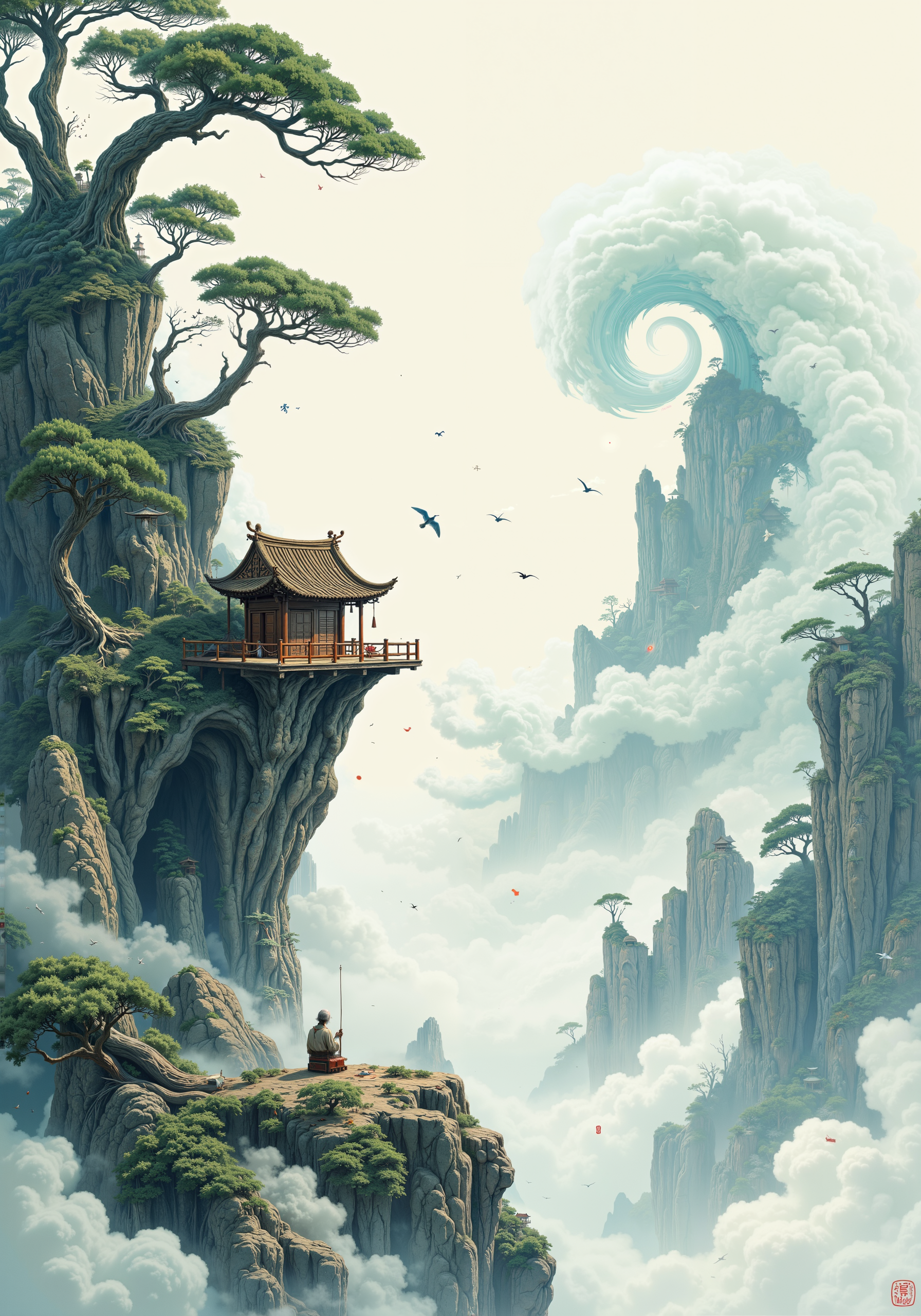 Ancient Daoist immortal's celestial dwelling nestled among swirling ethereal clouds, executed in traditional xieyi style with fluid brushwork. Magnificent pine trees cling to impossible rock formations, their gnarled trunks and delicate needles rendered with dry-brush technique. Whispers of mineral blue-green pigments accentuate the immortal realm floating between heaven and earth. A venerable sage with flowing white beard sits in quiet meditation before a modest thatched pavilion, while cranesâsymbols of longevityâsoar through mist-shrouded peaks. Subtle cinnabar accents punctuate the predominantly monochromatic ink wash, embodying the Taoist principle of simplicity within complexity. Song Dynasty aesthetic with emphasis on spiritual resonance (qiyun) rather than mere representation. Negative space creates breathing room for immortal qi energy to circulate. Calligraphic inscription in seal script style suggests impermanence of mortal concerns. Harmonious balance of rocky verticality and horizontal cloud formations expresses perfect celestial order. <lora:NeonFantasyPrimeFLUX-000049:0.2> <lora:flux_floralizer:0.4> <lora:artilands:0.3> <lora:é»è²å¹»æ³_1.0:0.2> <lora:DND_GRAINYBOYZ_FG_FLUX_V2_ROMULUS_Lora:0.3> <lora:flux_dev:1>