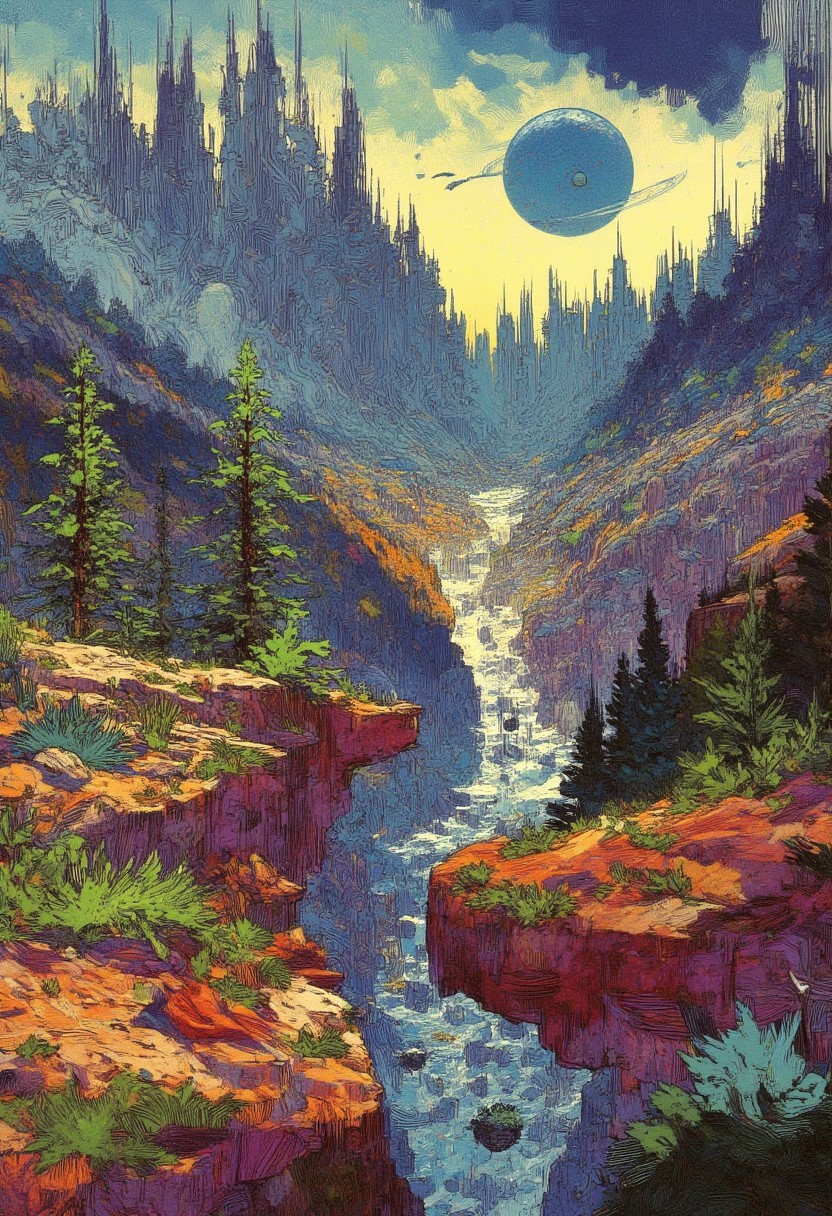 A digital impressionist painting with bold brush strokes about a fantasy landscape in outer space. The terrain is multi-layered with floating islands, cliffs, valleys and mountains. The vegetation is alien and colorful and there is a gigantic Monterey cypress tree in the center. The sky is colorful and features a large gas planet with rings. Moebiusstyle