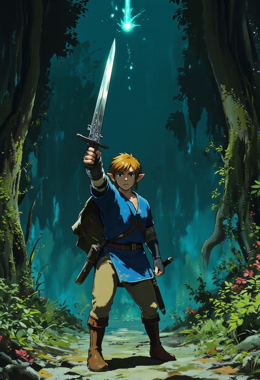 Vector art, uhd, 8k, 4k, epic, dramatic, Jujutsu kaisen manga, 4k quality, (Perfect hand:1.4), anime, (masterpiece), (detailed face), detailed, Rendered in a style redolent of Impressionism, the painting utilizes a vibrant. (Full body:1.4) digital artwork of Link wearing a blue tunic, tan pants, and brown boots. (He is holding the master sword in two hands with the blade pointed upwards in a low stance, ready to defend attacks with his sharp blade). (a metallic shine coming from the tip of the blade). He has a determined expression, ready to fight all enemies. The background is a dark forest. The overall mood is ethereal and ghostly. Unknown spirits haunt the forest.
