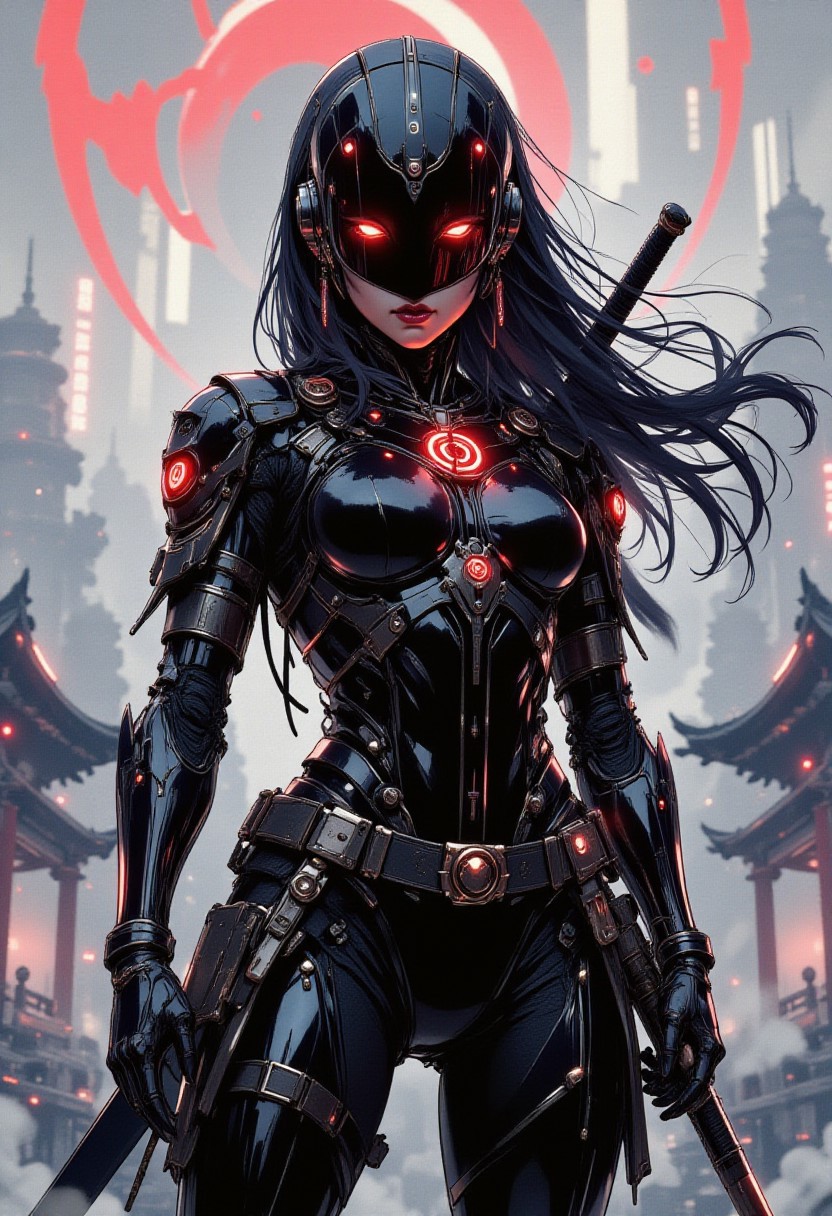 A digital anime artwork in the style of cklg, in the style of ck-ncr,, vibrant reflective holographic drawing in the style of ckhg, female cyberpunk robot samurai, robot face with mirrored face shield, hyperdetailed helmet, flowing black hair, reflective black and neon red SilverPulse armor, robot joints, body made of metals, cables and wires, a katana strapped to her back, abstract background suggesting eastern temple