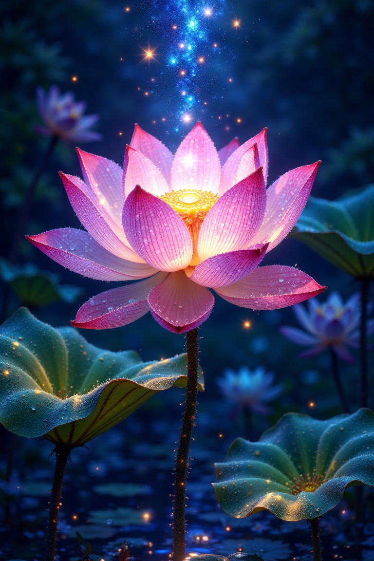 A vibrant illustration of a lotus flower, symbolizing purity, enlightenment, self-regeneration, and rebirth. The lotus is illuminated by shining starlight, with dew drops glistening on its petals. Set against an outdoor background with vibrant, natural colors. The scene is captured in extreme detail, UHD, 8K resolution, with natural lighting enhancing the fine art quality. The composition highlights the delicate beauty and spiritual significance of the lotus.