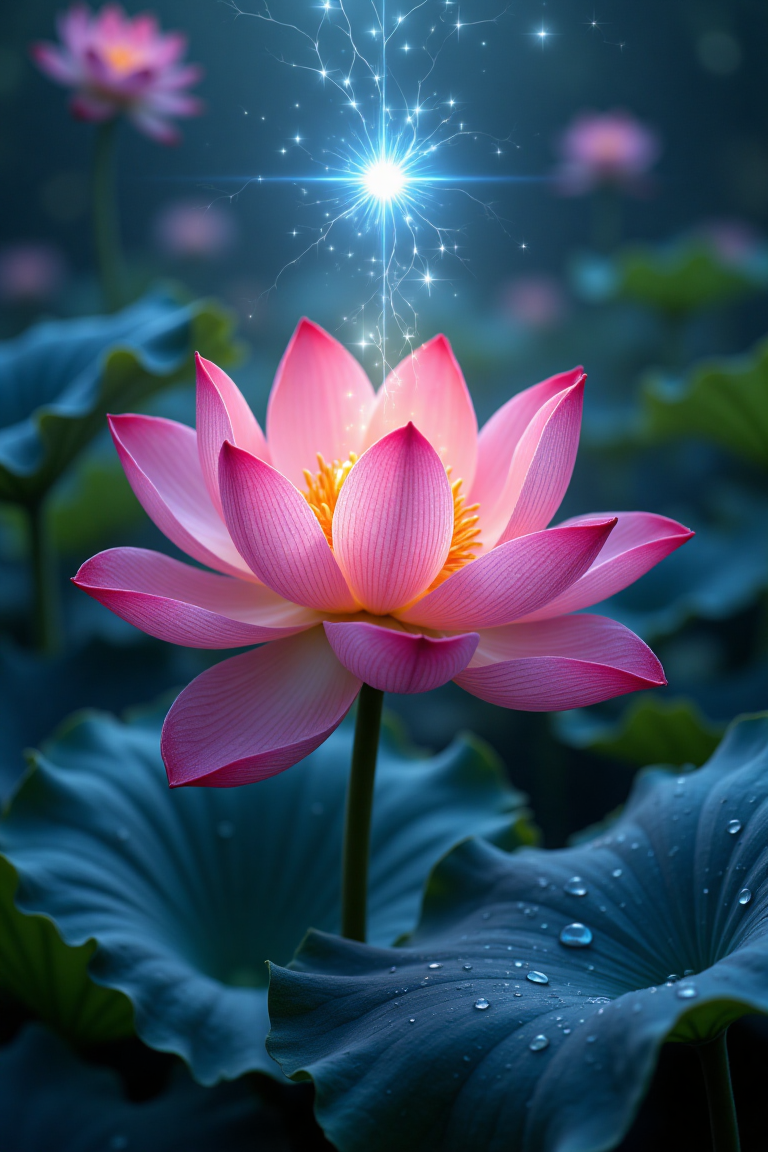 A vibrant illustration of a lotus flower, symbolizing purity, enlightenment, self-regeneration, and rebirth. The lotus is illuminated by shining starlight, with dew drops glistening on its petals. Set against an outdoor background with vibrant, natural colors. The scene is captured in extreme detail, UHD, 8K resolution, with natural lighting enhancing the fine art quality. The composition highlights the delicate beauty and spiritual significance of the lotus.,aidmafluxpro1.1