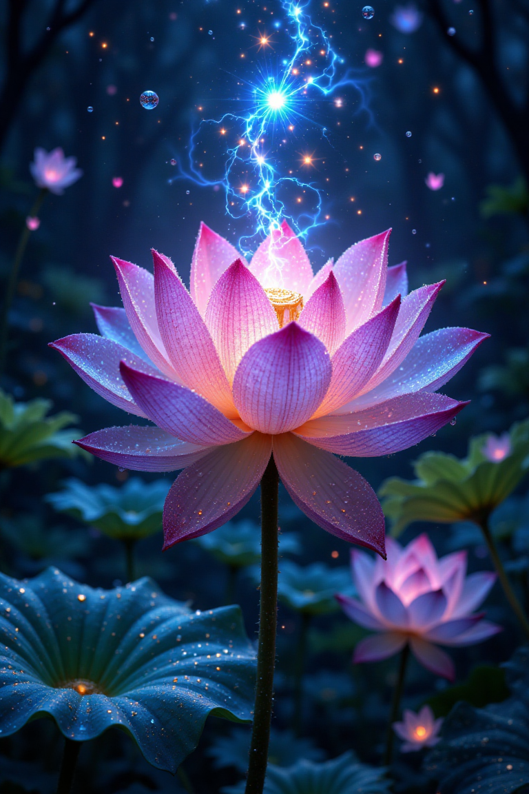 A vibrant illustration of a lotus flower, symbolizing purity, enlightenment, self-regeneration, and rebirth. The lotus is illuminated by shining starlight, with dew drops glistening on its petals. Set against an outdoor background with vibrant, natural colors. The scene is captured in extreme detail, UHD, 8K resolution, with natural lighting enhancing the fine art quality. The composition highlights the delicate beauty and spiritual significance of the lotus.,aidmafluxpro1.1